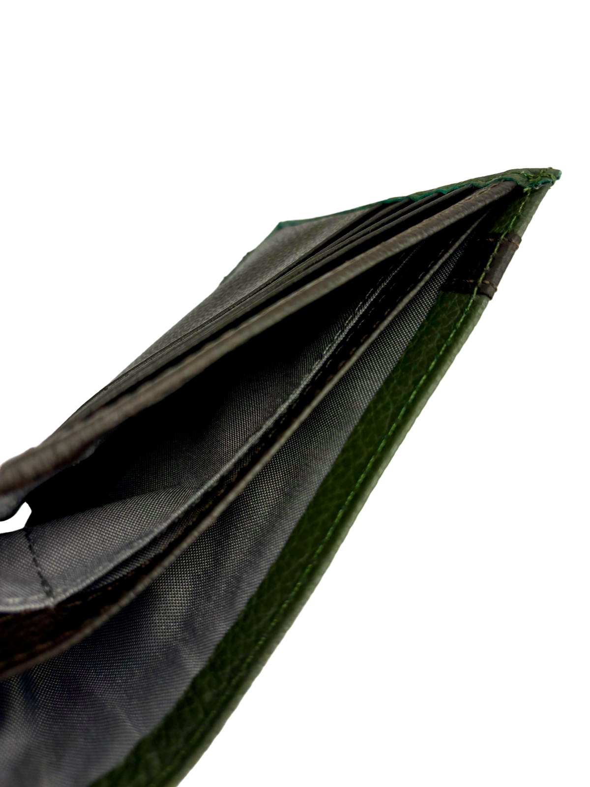 Billetera para hombre de diseño bicolor moderno y funcional, elaborada en cuero vacuno grabado y liso que combina elegancia y durabilidad. Su estructura de dos cuerpos ofrece una distribución práctica con ocho compartimentos para tarjetas, doble espacio para billetes y dos compartimentos multifuncionales para objetos pequeños. Incorpora bloqueo R-FID para mayor seguridad y protección de tus documentos. Ideal para quienes buscan un accesorio sofisticado y contemporáneo.