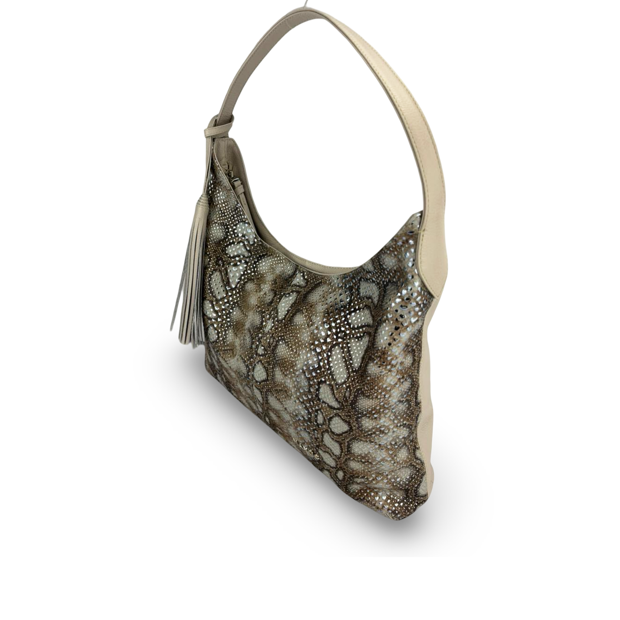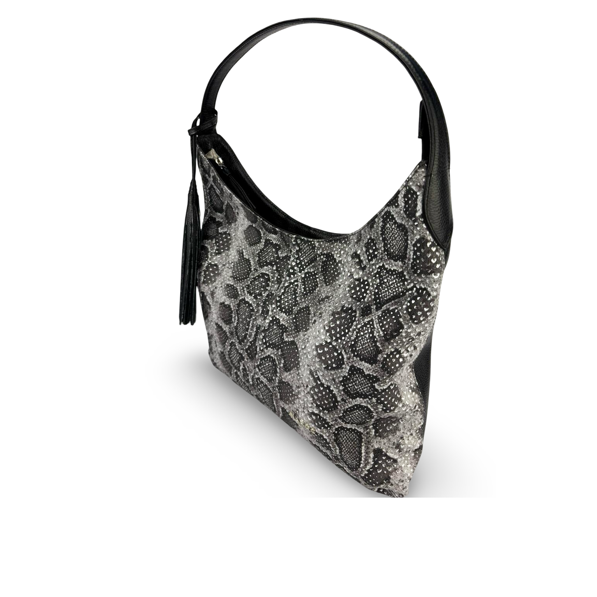 BOLSO EN CUERO PARA MUJER GRABADO CON BORLA DECORATIVA