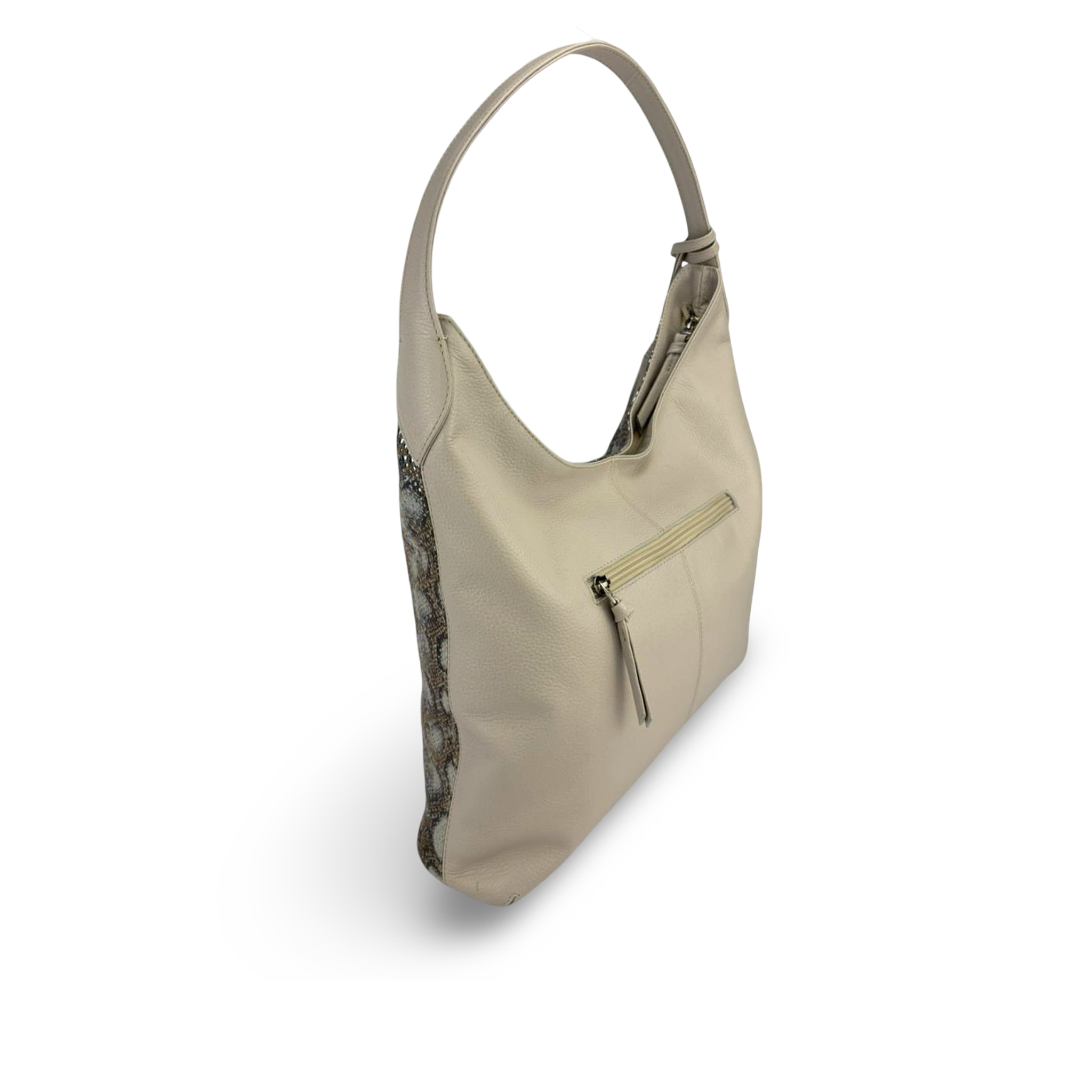 BOLSO EN CUERO PARA MUJER CON LONA – COLOR ARENA CON ESTAMPADO BOTÁNICO