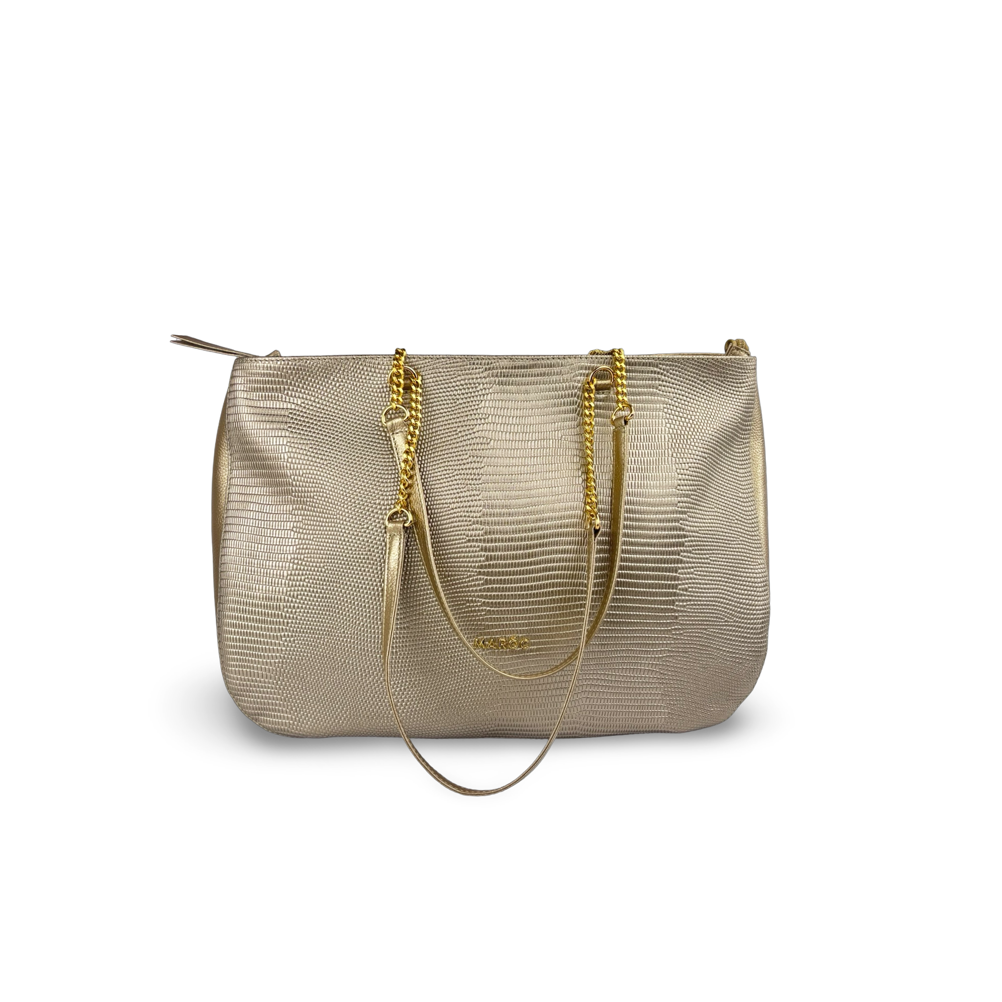 Diseño sofisticado ideal para looks oscuros y outfits con tacones. Cuenta con un compartimento principal amplio, bolsillos internos funcionales y bolsillo externo con cierre para mayor organización. Su cierre con cremallera brinda seguridad y las asas con cadena aportan un toque moderno y femenino. Fabricado en Colombia en cuero vacuno grabado y liso, con forro en poliéster y herrajes resistentes.