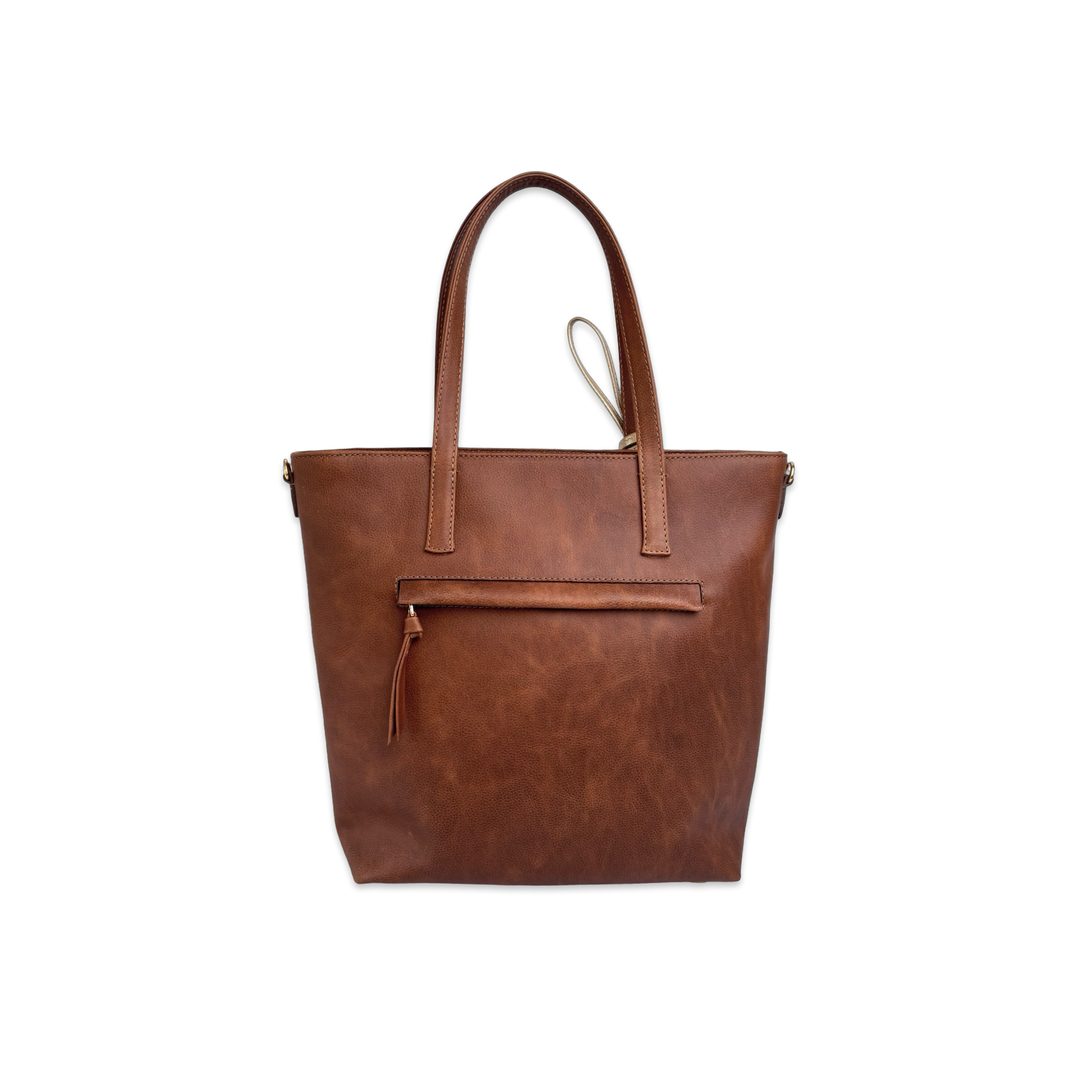 Diseño elegante y amplio, ideal para el día a día o jornadas largas. Su formato tipo tote ofrece un compartimento principal espacioso con bolsillos internos que facilitan la organización, además de cierre de cremallera para mayor seguridad y mosquetón portallaves. Fabricado en Colombia en cuero vacuno grabado y liso, con forro en poliéster y herrajes resistentes.