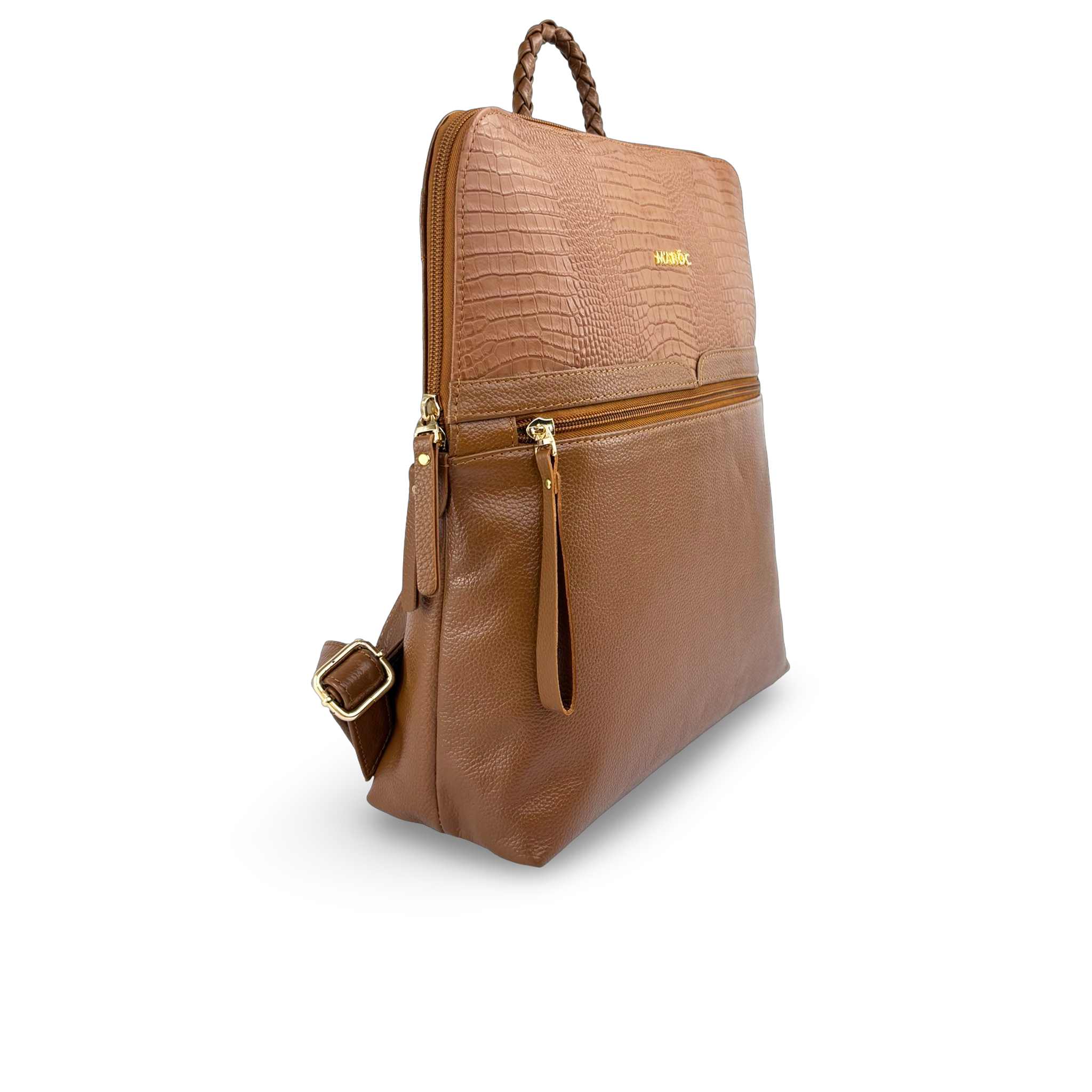 Este morral compacto para mujer de Maroc combina estilo, funcionalidad y comodidad en un solo diseño. Confeccionado en 100% cuero vacuno liso y grabado, su estructura resistente protege tus pertenencias mientras te permite mantener todo organizado: compartimento interno acolchado para portátil de hasta 13”, bolsillo tarjetero, porta lápices y porta celular integrados. Además, cuenta con bolsillo frontal de fácil acceso, bolsillo seguro en el espaldar y un portallaves interno con mosquetón, ideal para tener todo a la mano de forma práctica y segura. Sus correas ajustables y acolchadas garantizan confort durante el uso diario, perfecto para trabajo, estudio o viajes urbanos. Dimensiones aproximadas: Alto 40 cm × Ancho 33 cm × Fondo 12 cm