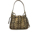Bolso tipo Bucket para mujer elaborado en cuero vacuno grabado con estampado pitón, un diseño moderno que destaca por su textura y estilo.