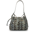 Bolso tipo Bucket para mujer elaborado en cuero vacuno grabado con estampado pitón, un diseño moderno que destaca por su textura y estilo.