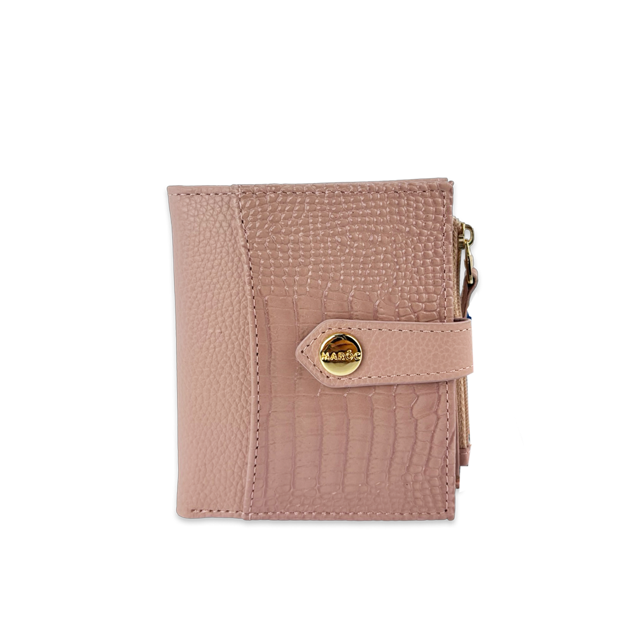 Billetera para mujer en cuero vacuno grabado, con elegante aplique metálico dorado logo Maroc en la parte frontal. Su diseño compacto y funcional cuenta con 6 compartimentos para tarjetas, un espacio para billetes, ventanilla para documentos y monedero lateral con cierre de cremallera. Con botón a presión que asegura tus pertenencias, es un accesorio sofisticado, práctico y resistente. Hecho en Colombia con herrajes de calidad y forro interno en poliéster. cuenta con Bloqueo RFID Para mantener tus documentos a salvo