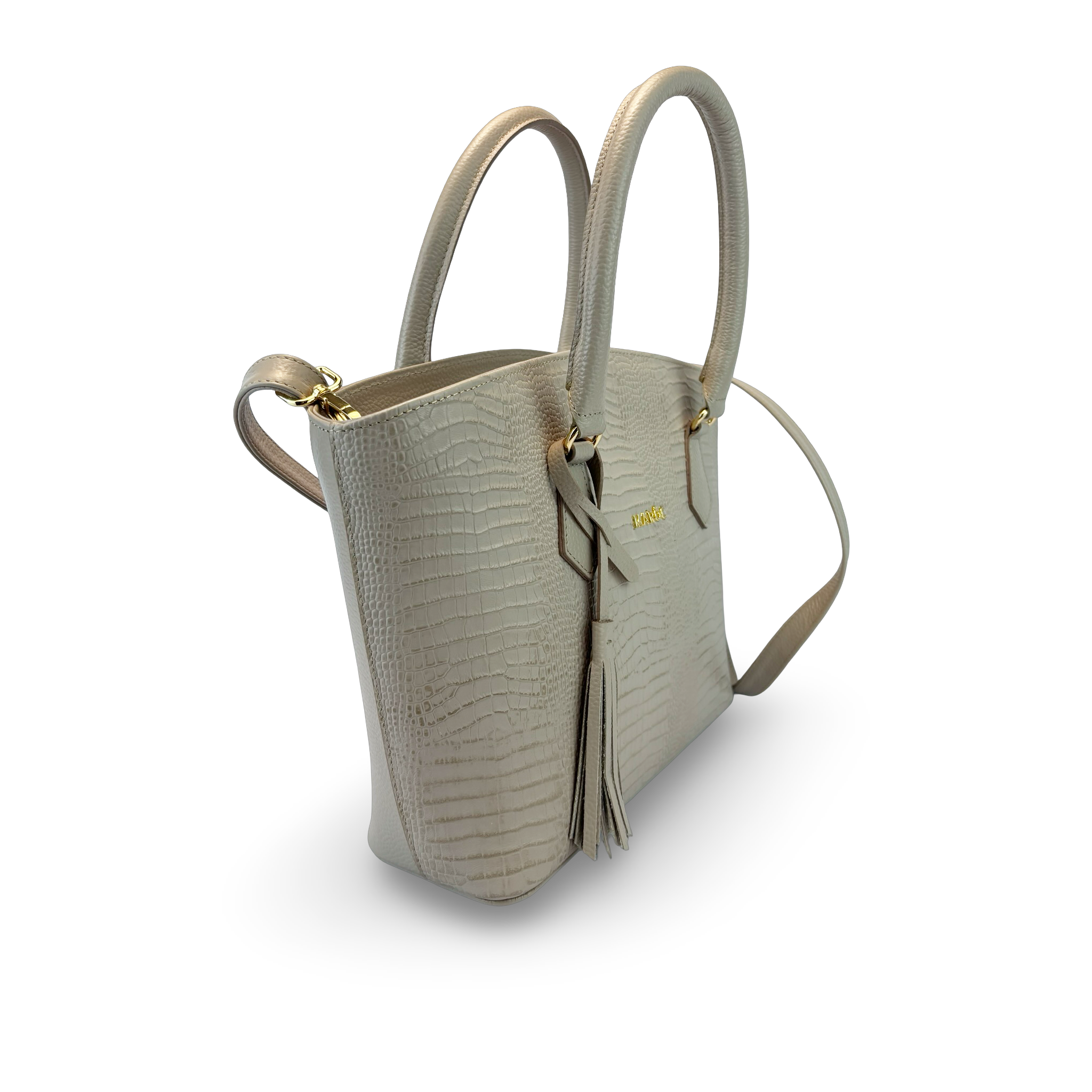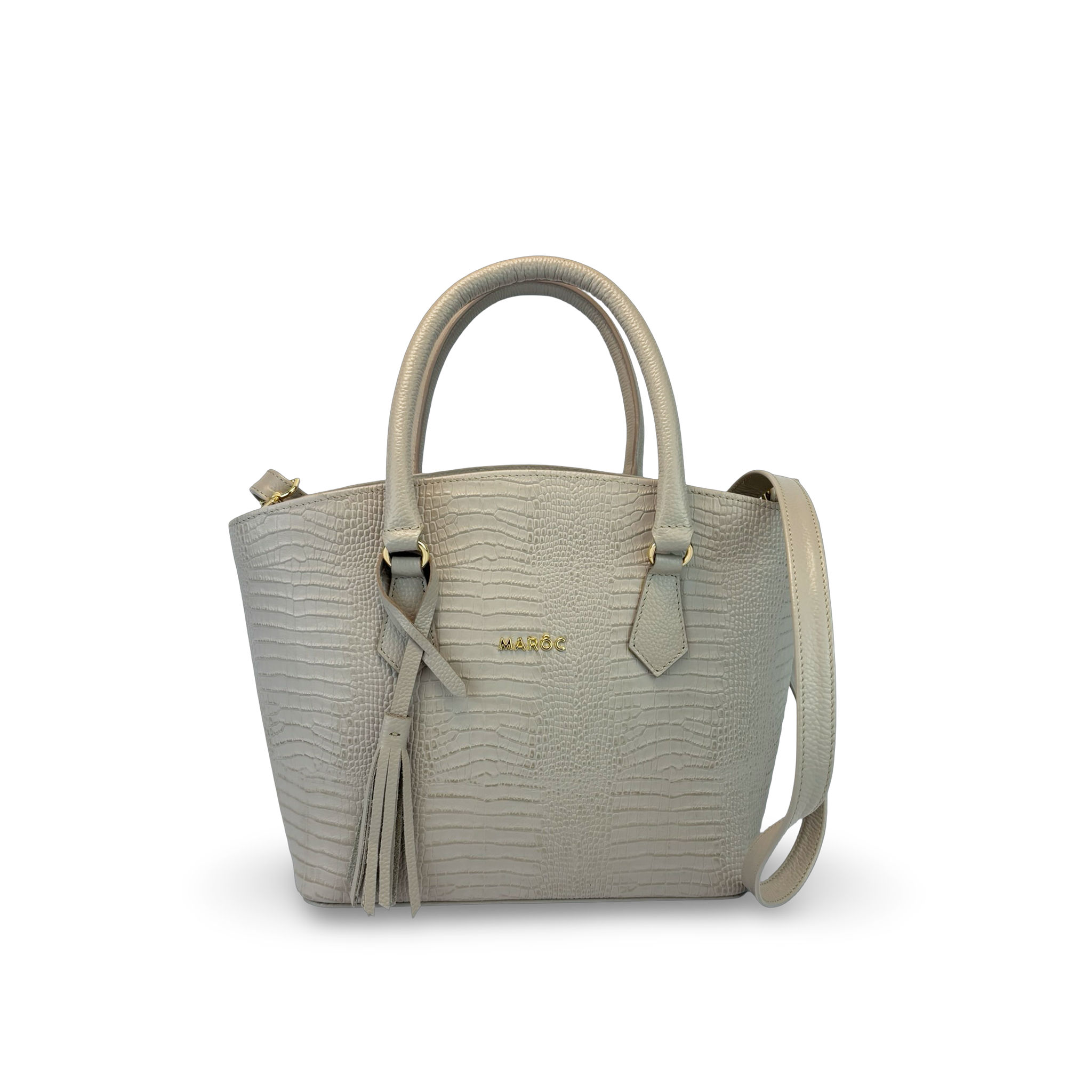 Bolso tote para mujer elaborado en 100% cuero colombiano, con diseño versátil de dos estilos: asas para llevar al hombro o bandolera ajustable para cruzar. Incluye borla decorativa, aplique metálico del logo Maroc en la parte frontal y base con cinco zapatas que protegen el bolso del contacto con el suelo. Su interior cuenta con un compartimento amplio, bolsillo interno con cremallera y mosquetón portallaves para mayor practicidad.