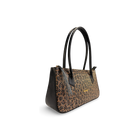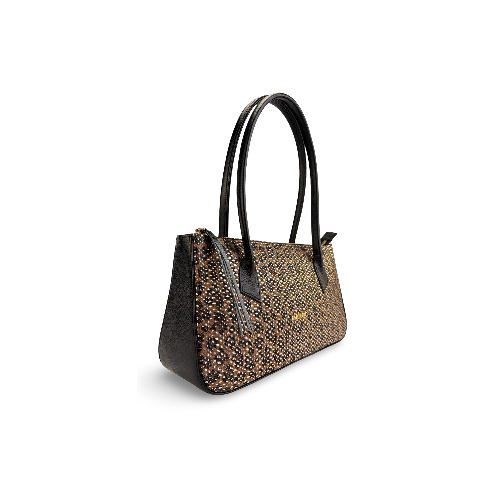 Bolso de hombro para mujer de estilo minimalista, elaborado en 100% cuero vacuno grabado, ideal para elevar cualquier look con un toque sofisticado. Su diseño incorpora un aplique metálico dorado frontal que añade distinción, mientras que su interior ofrece un compartimento principal amplio, un bolsillo interno con cremallera para objetos de valor y otro bolsillo abierto para acceso rápido al celular. Cierre superior con cremallera para mayor seguridad. Dimensiones aproximadas: Alto 16.5 cm, Ancho 27 cm, Fondo 10 cm, Asas 9 cm.