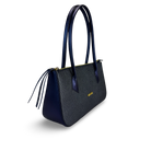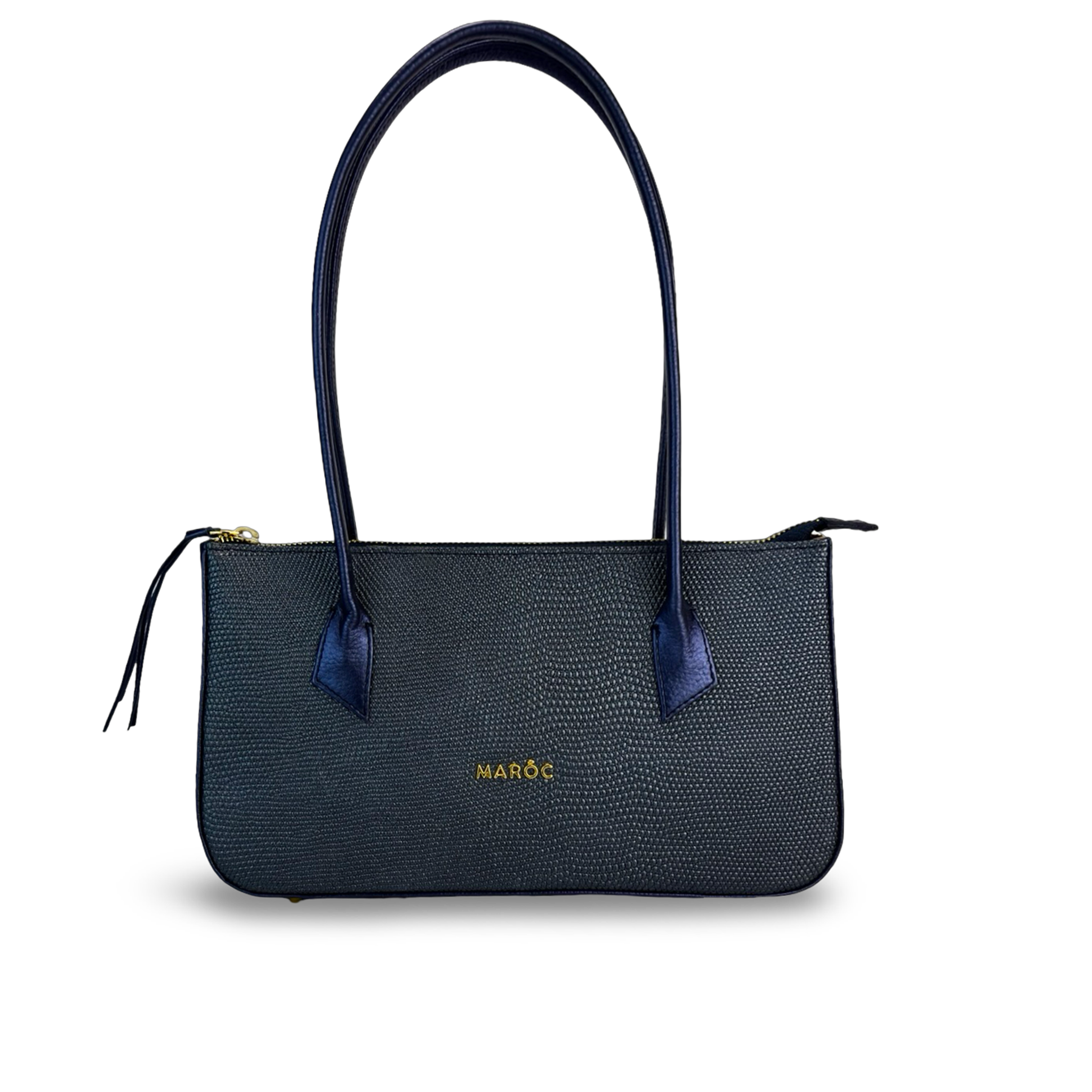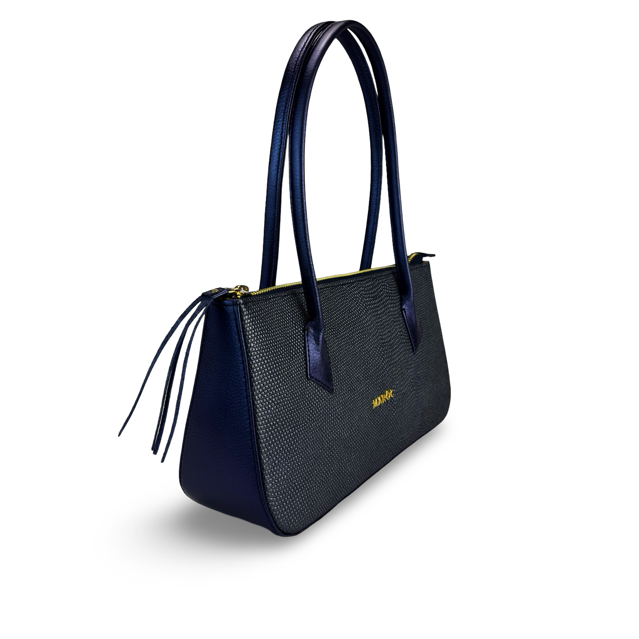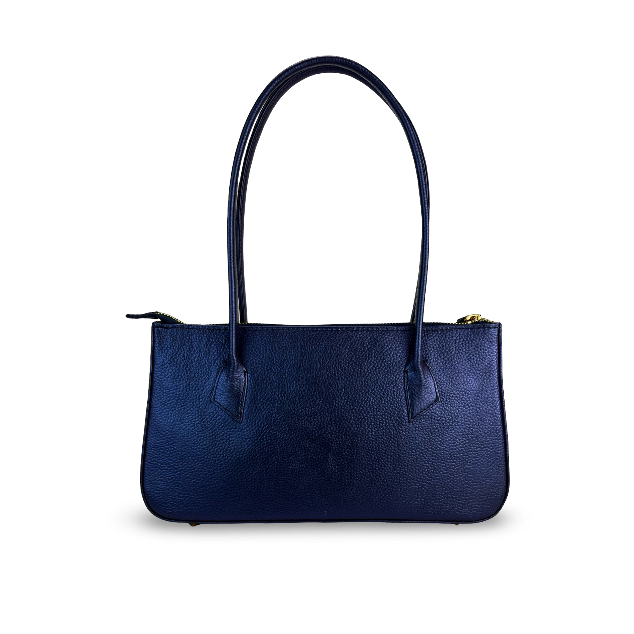 Bolso de hombro para mujer de estilo minimalista, elaborado en 100% cuero vacuno grabado, ideal para elevar cualquier look con un toque sofisticado. Su diseño incorpora un aplique metálico dorado frontal que añade distinción, mientras que su interior ofrece un compartimento principal amplio, un bolsillo interno con cremallera para objetos de valor y otro bolsillo abierto para acceso rápido al celular. Cierre superior con cremallera para mayor seguridad. Dimensiones aproximadas: Alto 16.5 cm, Ancho 27 cm, Fondo 10 cm, Asas 9 cm.