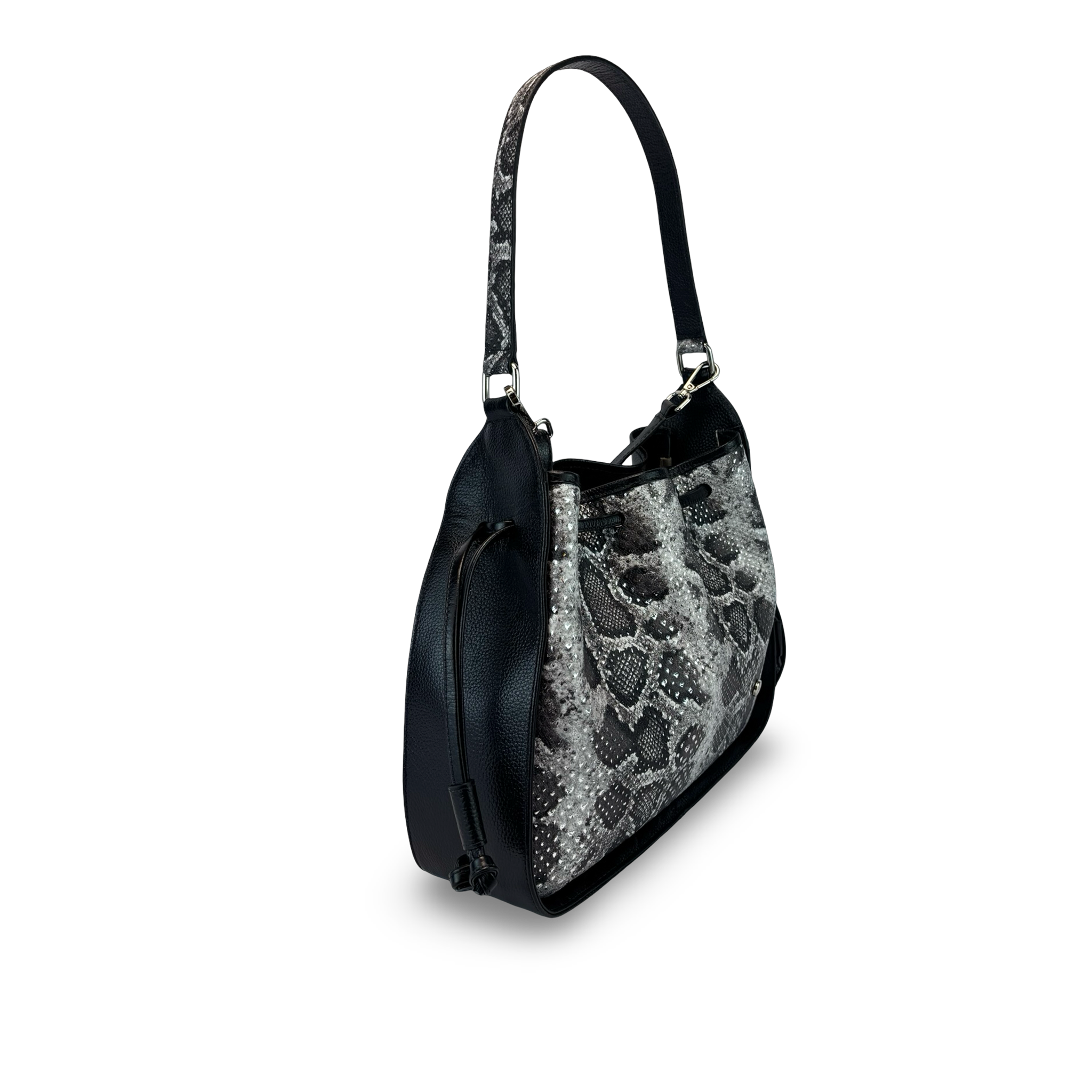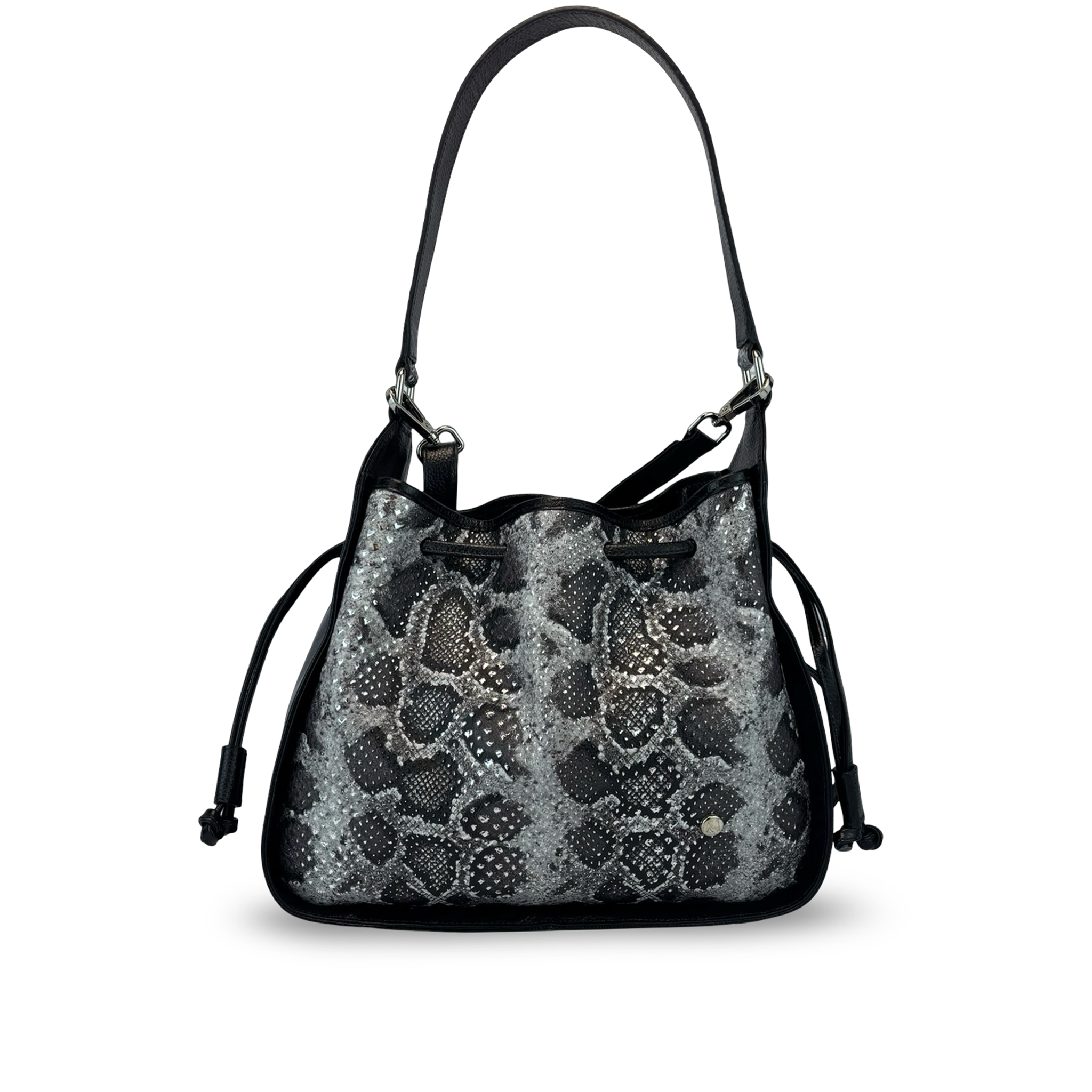 Bolso tipo Bucket para mujer elaborado en cuero vacuno grabado con estampado pitón, un diseño moderno que destaca por su textura y estilo.