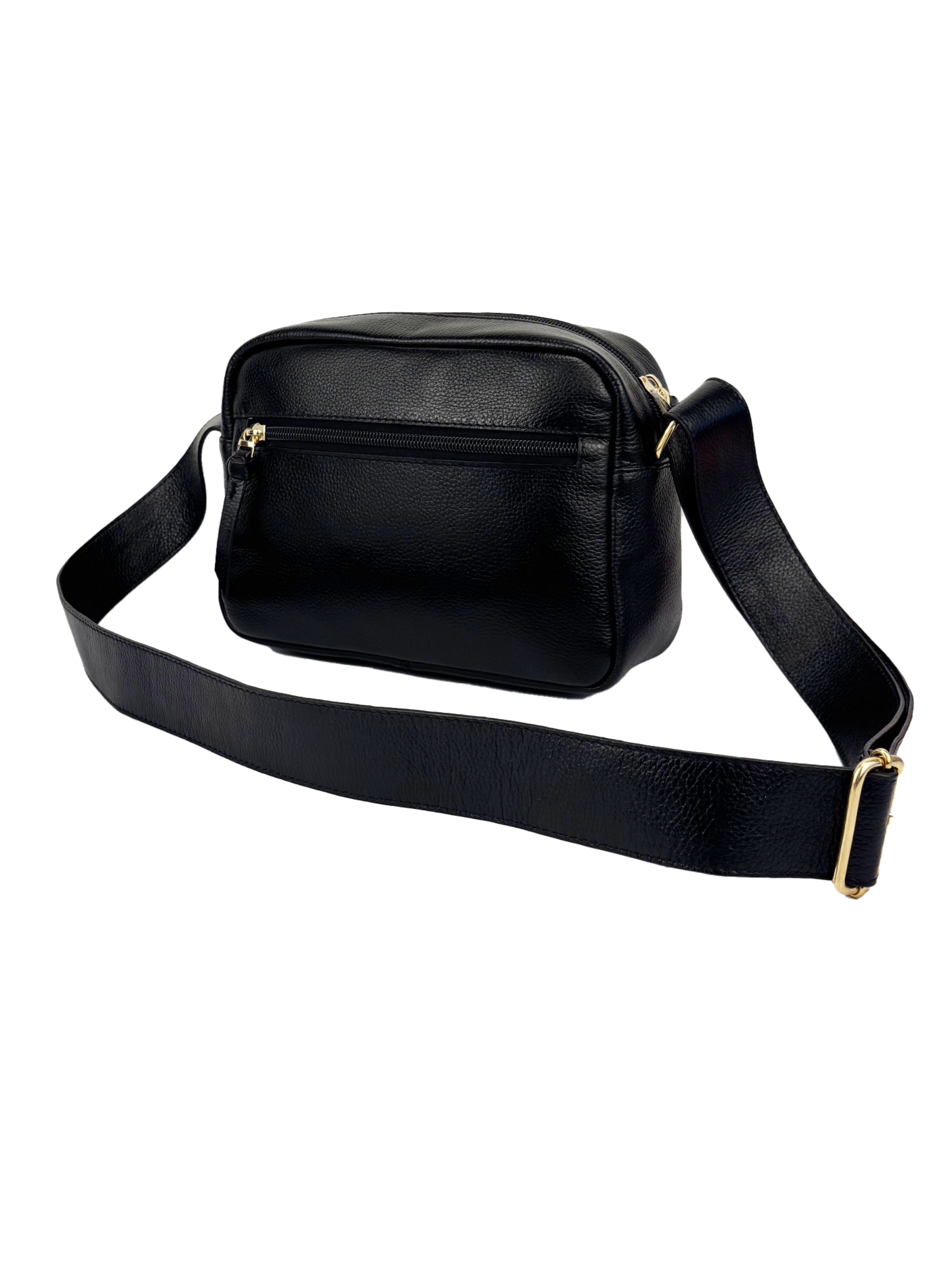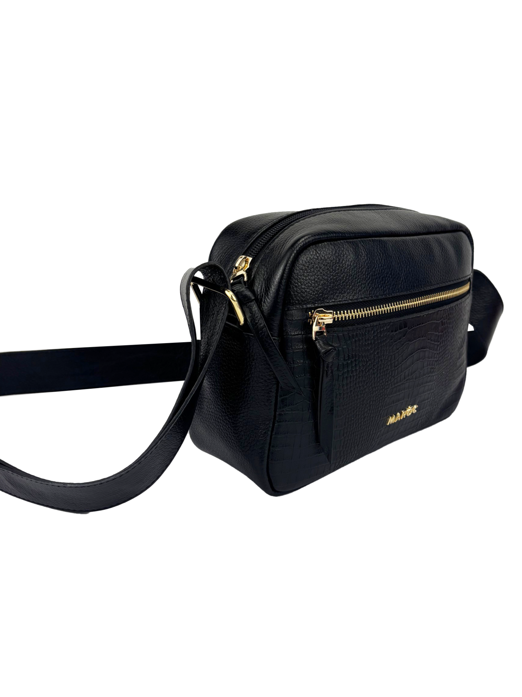 Complementa tus looks con el bolso manos libres Maroc, una pieza moderna y sofisticada elaborada en 100% cuero vacuno grabado, metalizado y liso. Su diseño compacto con aplique metálico dorado frontal refleja elegancia y estilo urbano. Cuenta con varios compartimentos para mantener todo en orden: un bolsillo interno con cremallera, otro abierto para celular o accesorios y un bolsillo externo funcional. Incluye correa ancha ajustable y portallaves interno con mosquetón, ideal para llevarlo cruzado o al hombro. Dimensiones aproximadas: Alto 16 cm x Ancho 23 cm x Fondo 9 cm. Hecho artesanalmente en Colombia con herrajes de alta calidad.