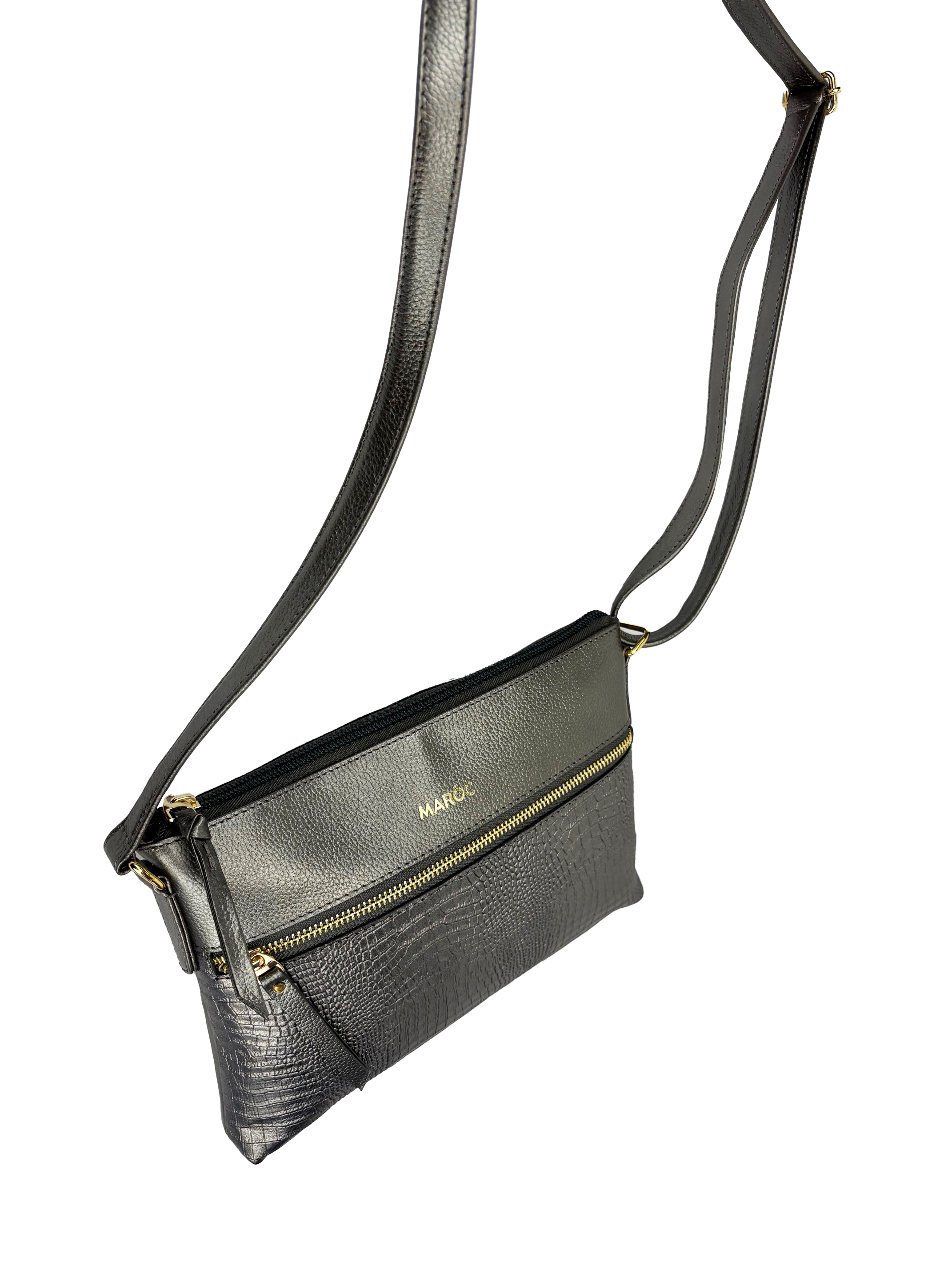 Bolso Manos Libres Mujer en cuero vacuno; combinado (terminación cuero grabado y cuero liso natural); cierre con cremallera; un bolsillo con cremallera; bolsillo interno cierre con cremallera; bolsillo trasero con cierre; bandolera graduable con hebilla; detalle: cuero grabado de enfrente en forma de U que da un diseño diferente, slider de cremalleras con accesorio sutil en cuero; placa metálica marca Maróc