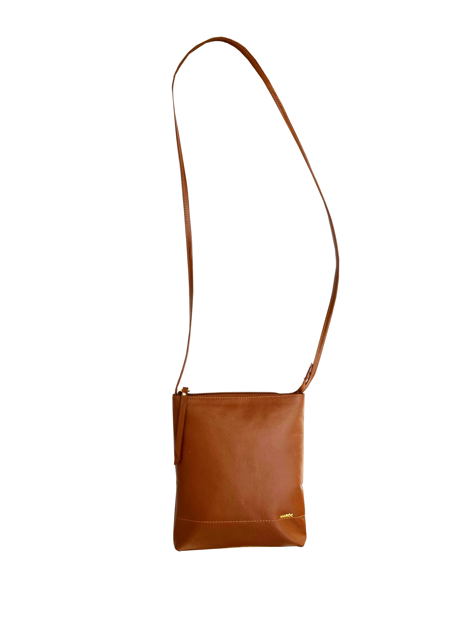 Bolso manos libres Mujer en cuero vacuno; terminación cuero liso natural; cierre con cremallera; bolsillo interno con cremallera y porta celular; correa graduable internamente; contiene la marca Maróc