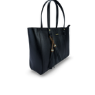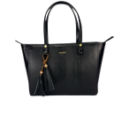 Bolso tipo tote para mujer elaborado en cuero vacuno grabado y liso, con borla decorativa y aplique metálico dorado del logo MAROC en la parte frontal que realzan su diseño sofisticado y funcional.