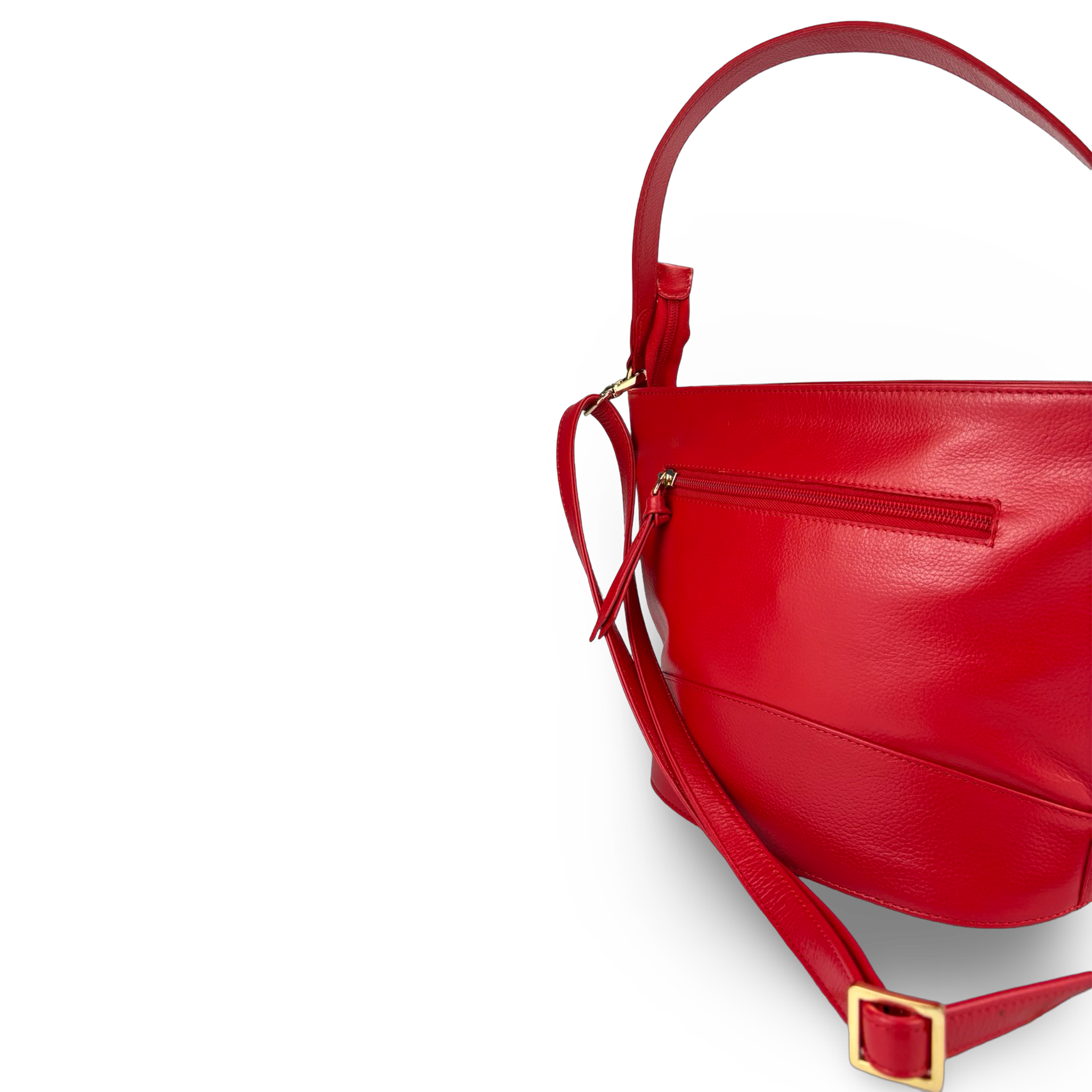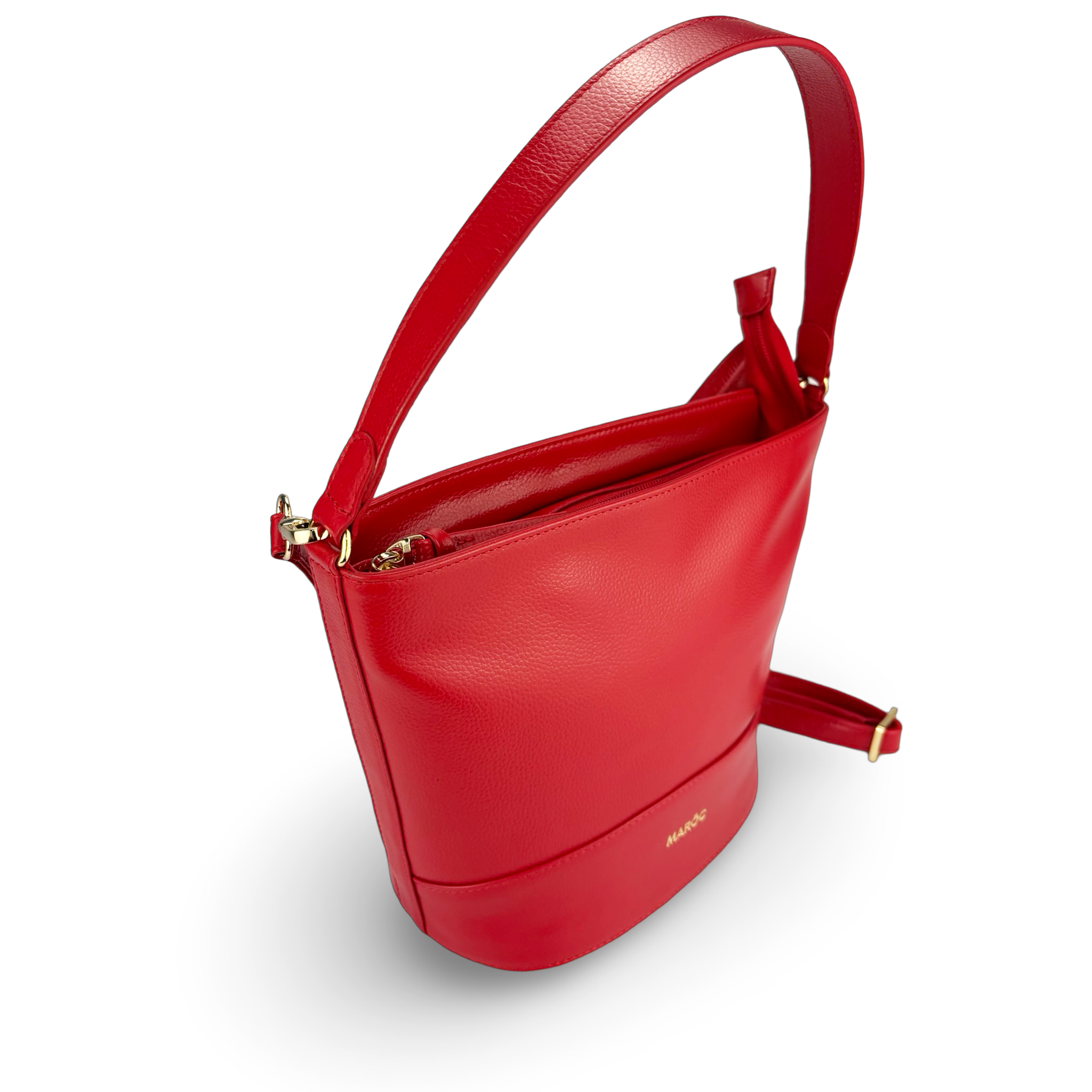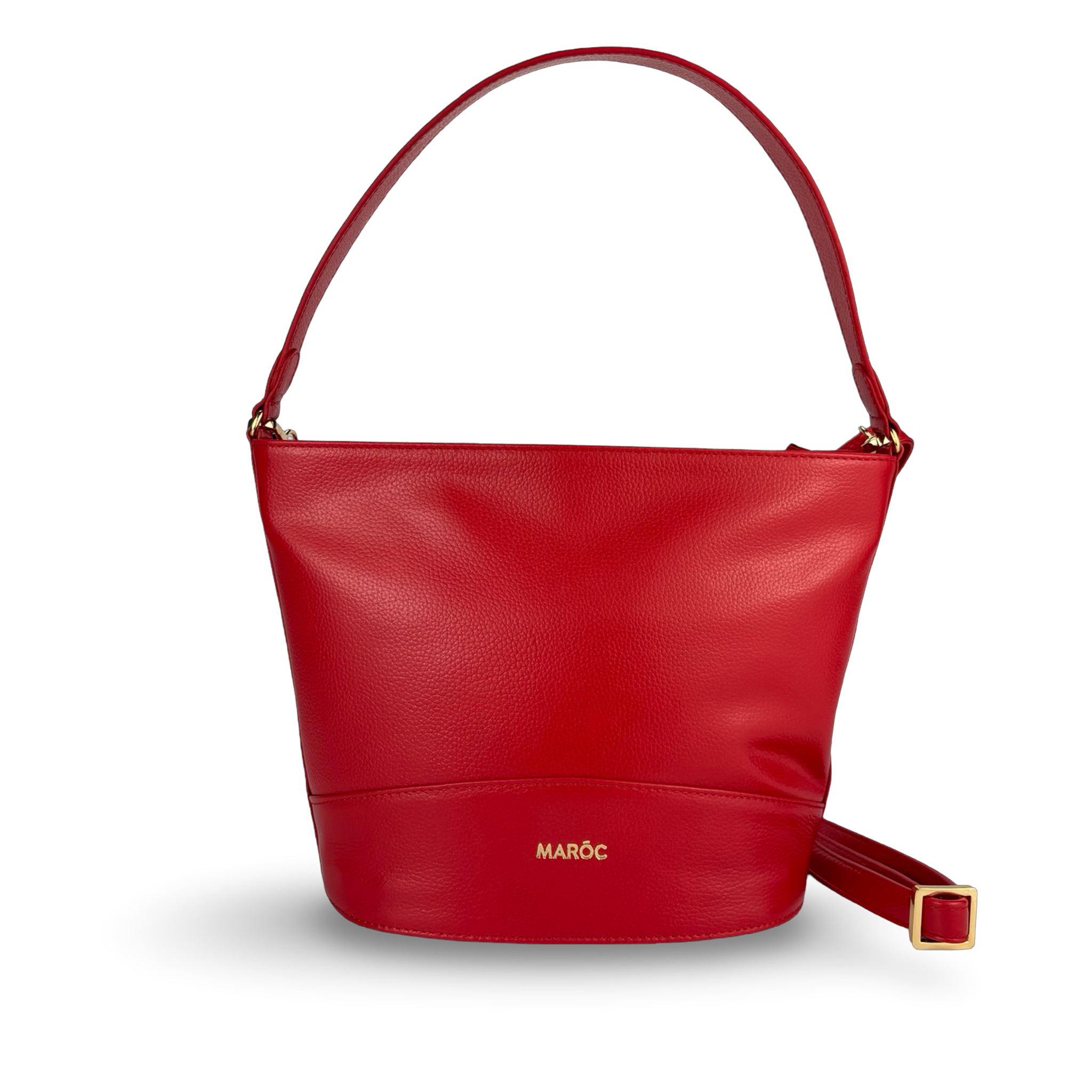 Bolso tipo bucket para mujer, elaborado en cuero vacuno con terminación natural. Su diseño versátil y moderno incluye cierre con cremallera para mayor seguridad y comodidad.