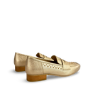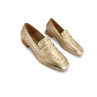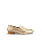 Mocasín para mujer elaborado en cuero vacuno grabado y metalizado, con antifaz decorativo y apliques metálicos dorados (studs) que realzan su diseño moderno y elegante.