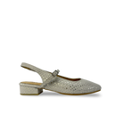 Zapato plano para mujer en cuero vacuno grabado y metalizado, con tacón bajo de 2 cm Aproximadamente que combina comodidad y estilo. Diseño con punta fina y cierre tipo slingback con hebilla ajustable para un calce perfecto. Hecho en Colombia, ideal para looks casuales y elegantes.