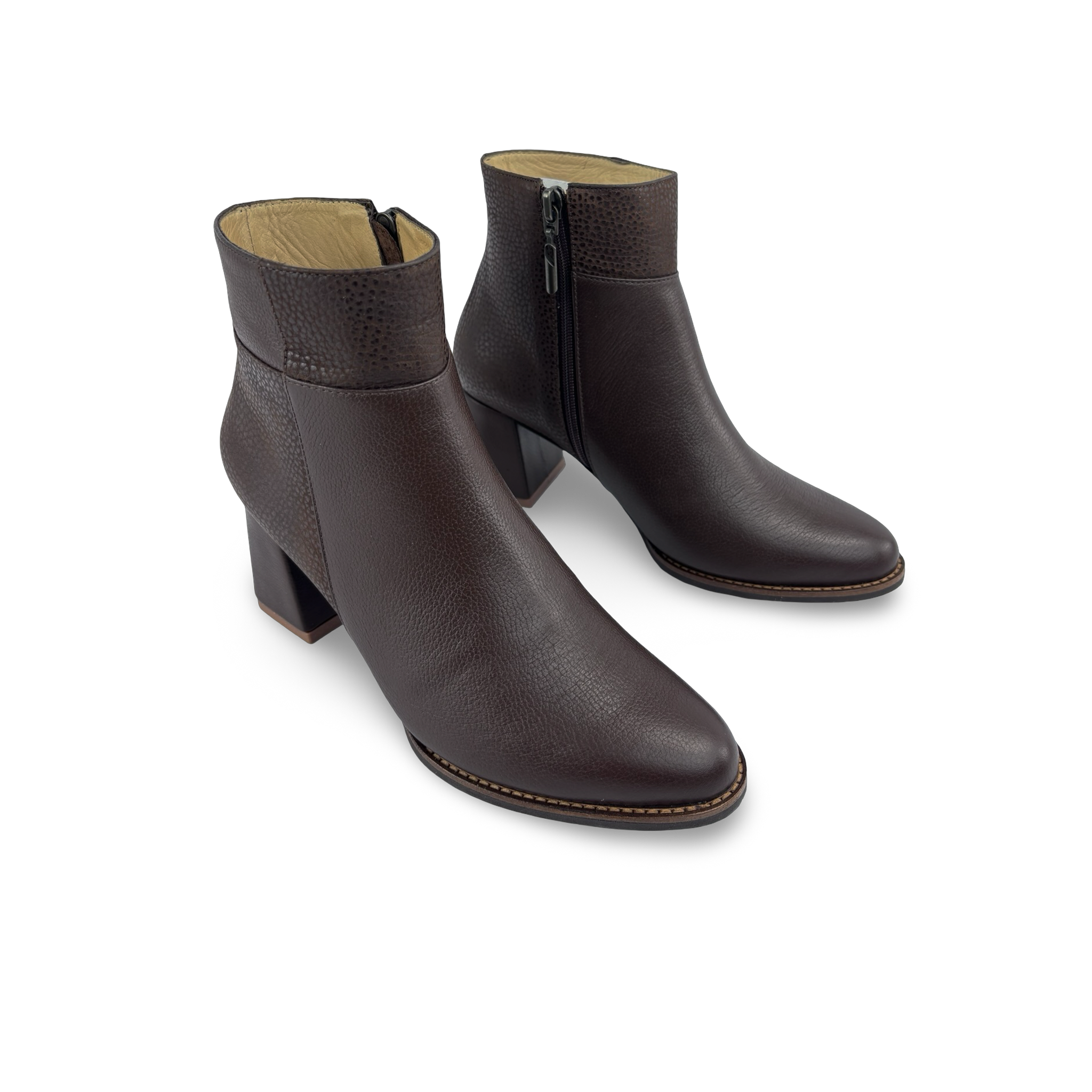 Botín para mujer en cuero vacuno liso y grabado, con diseño texturizado que combina estilo y comodidad. Cuenta con tacón de 4 cm aproximadamente en caucho, punta fina y cremallera lateral para un ajuste práctico. Perfecto para looks elegantes, elaborado en Colombia con acabados de alta calidad.