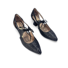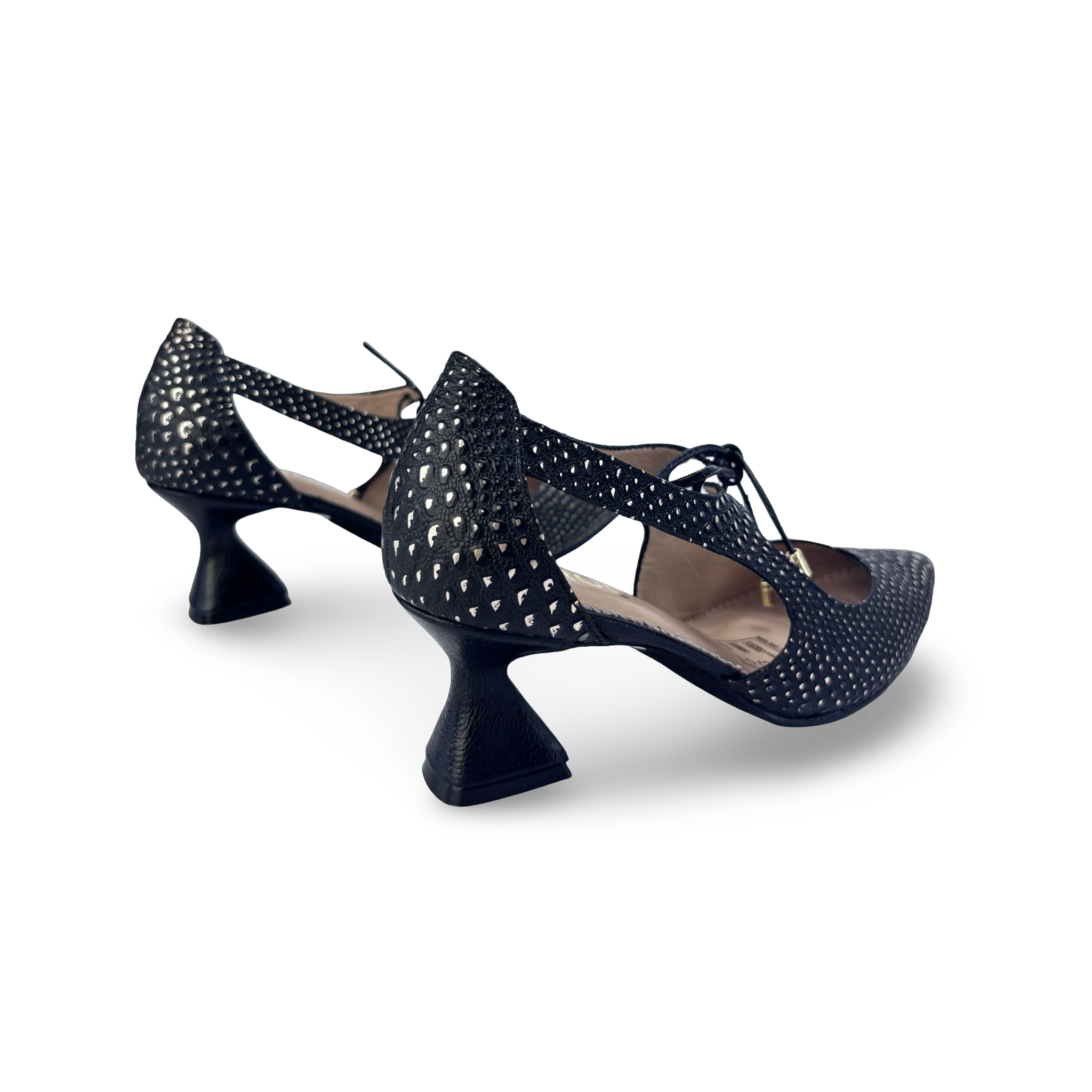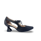 Tacón para mujer de diseño delicado y femenino, con un elegante lazo ajustable en el empeine que aporta un toque distintivo y sofisticado. Elaborado en cuero 100% vacuno grabado y liso, combina materiales que realzan su textura y estilo. Su tacón de 3.5 cm ofrece una altura cómoda para el día a día, mientras que la punta fina estiliza la silueta del pie. Ideal para looks formales o casuales con un aire refinado.