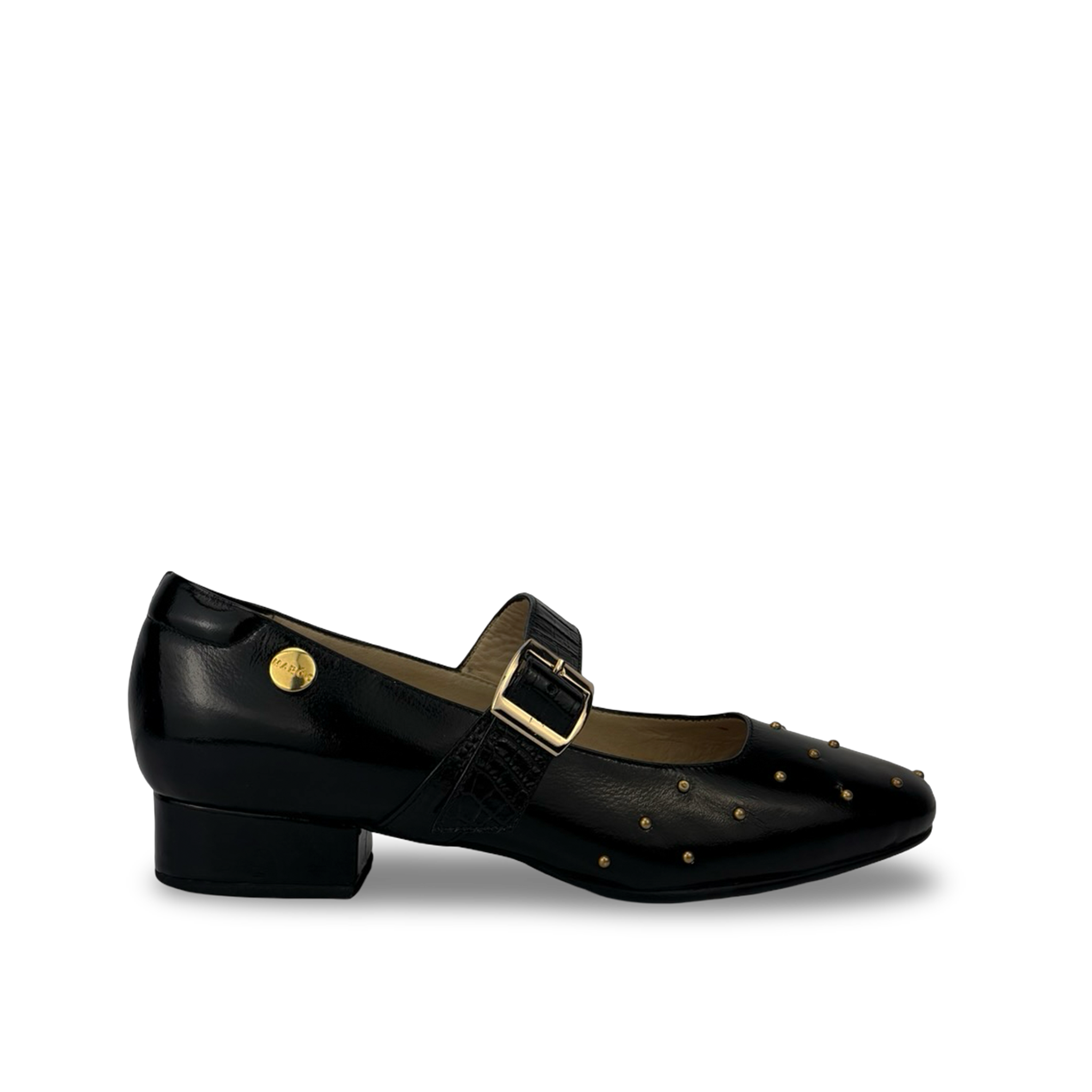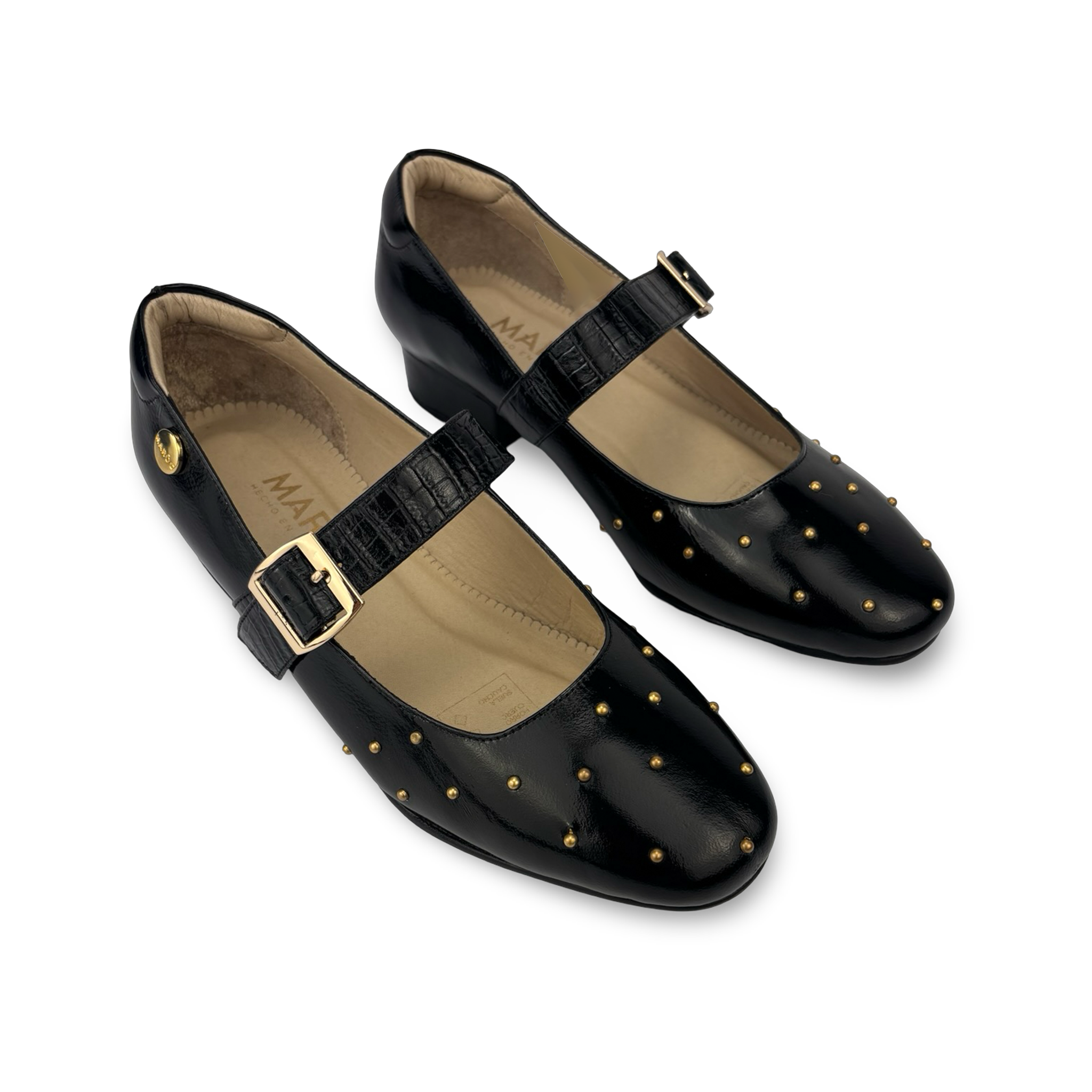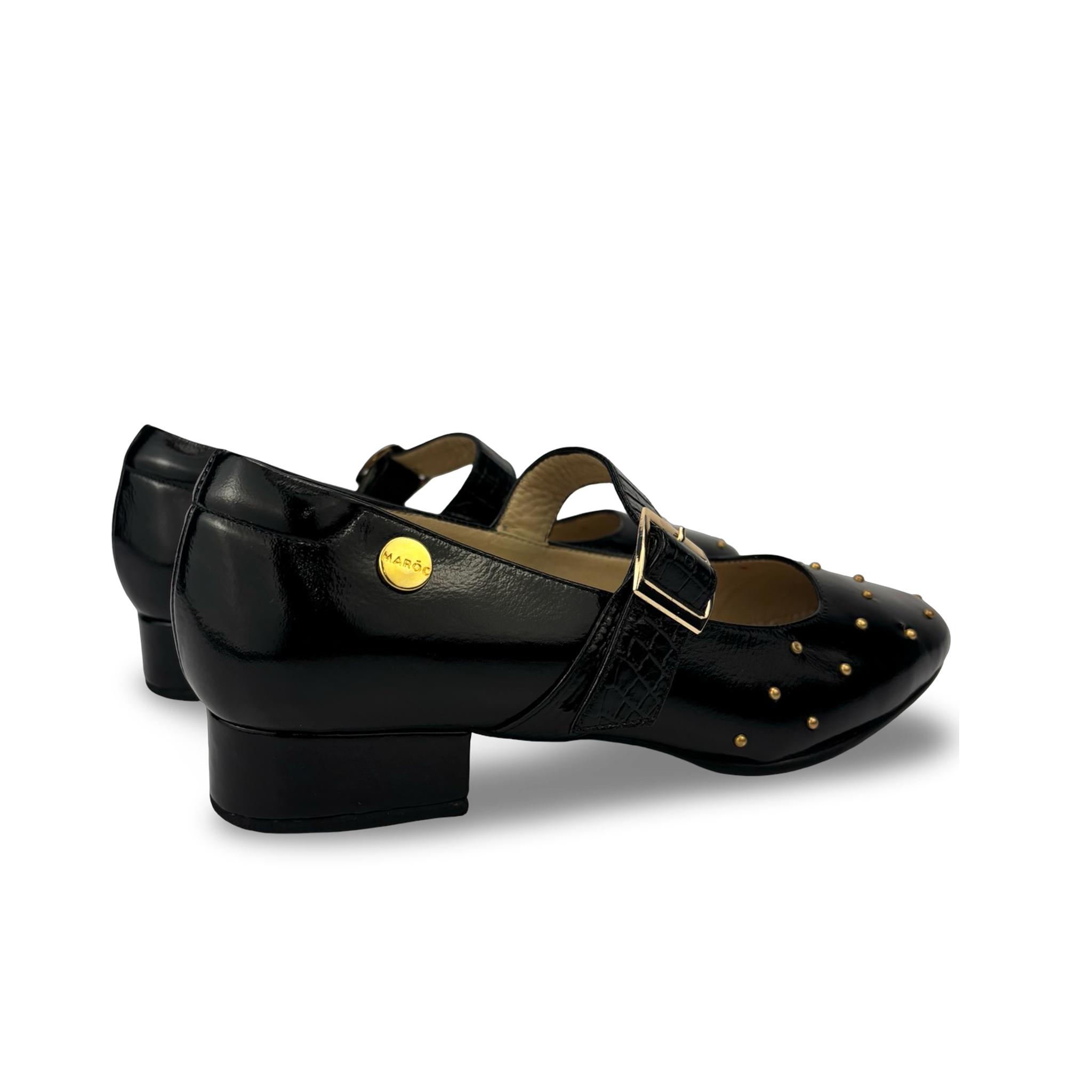 - Tipo: Zapato plano con tacón bajo para mujer, con aplique metálico dorado logo marca Maroc en el lateral del calzado con taches metálicos decorativos dorados sobre el empeine.