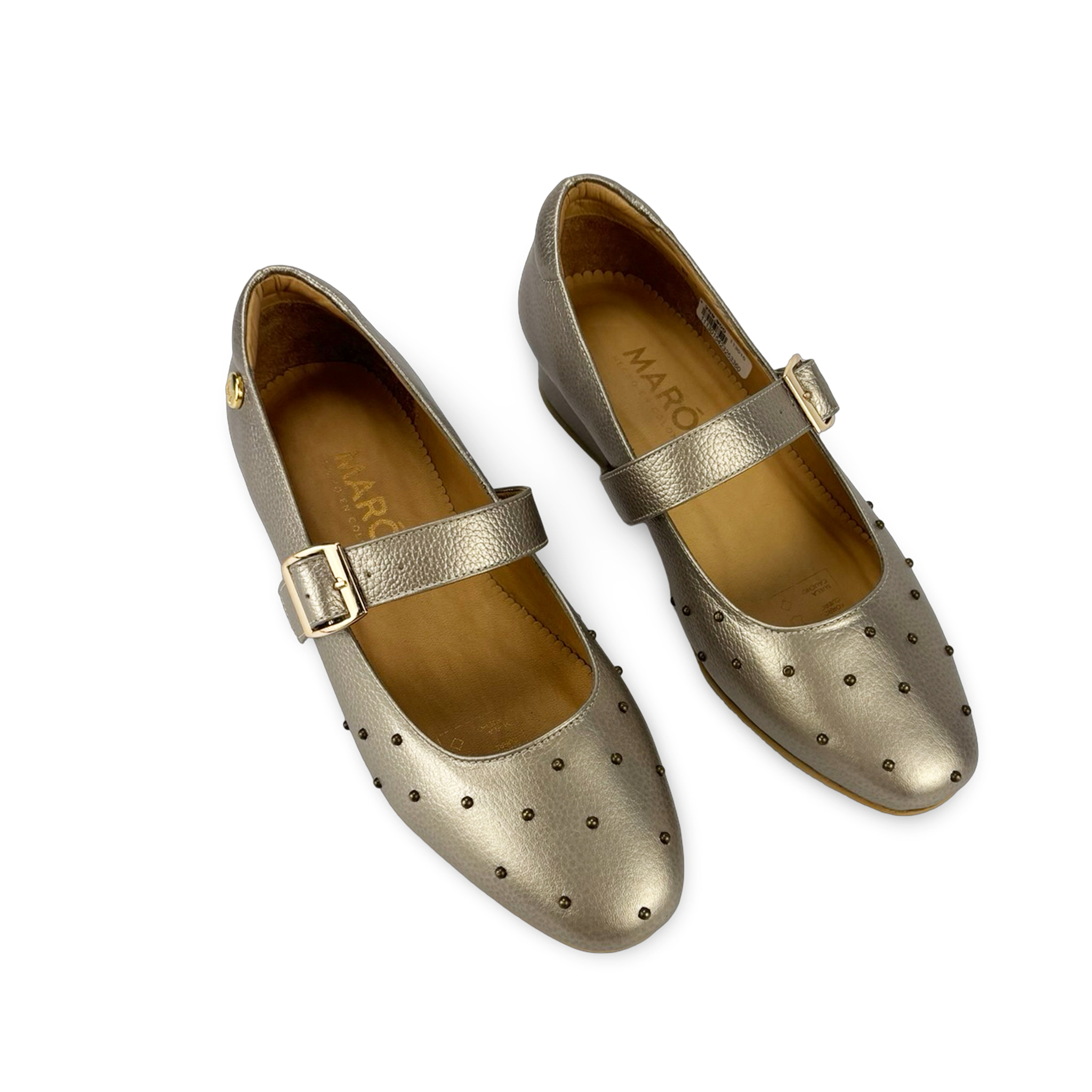 - Tipo: Zapato plano con tacón bajo para mujer, con aplique metálico dorado logo marca Maroc en el lateral del calzado con taches metálicos decorativos dorados sobre el empeine.