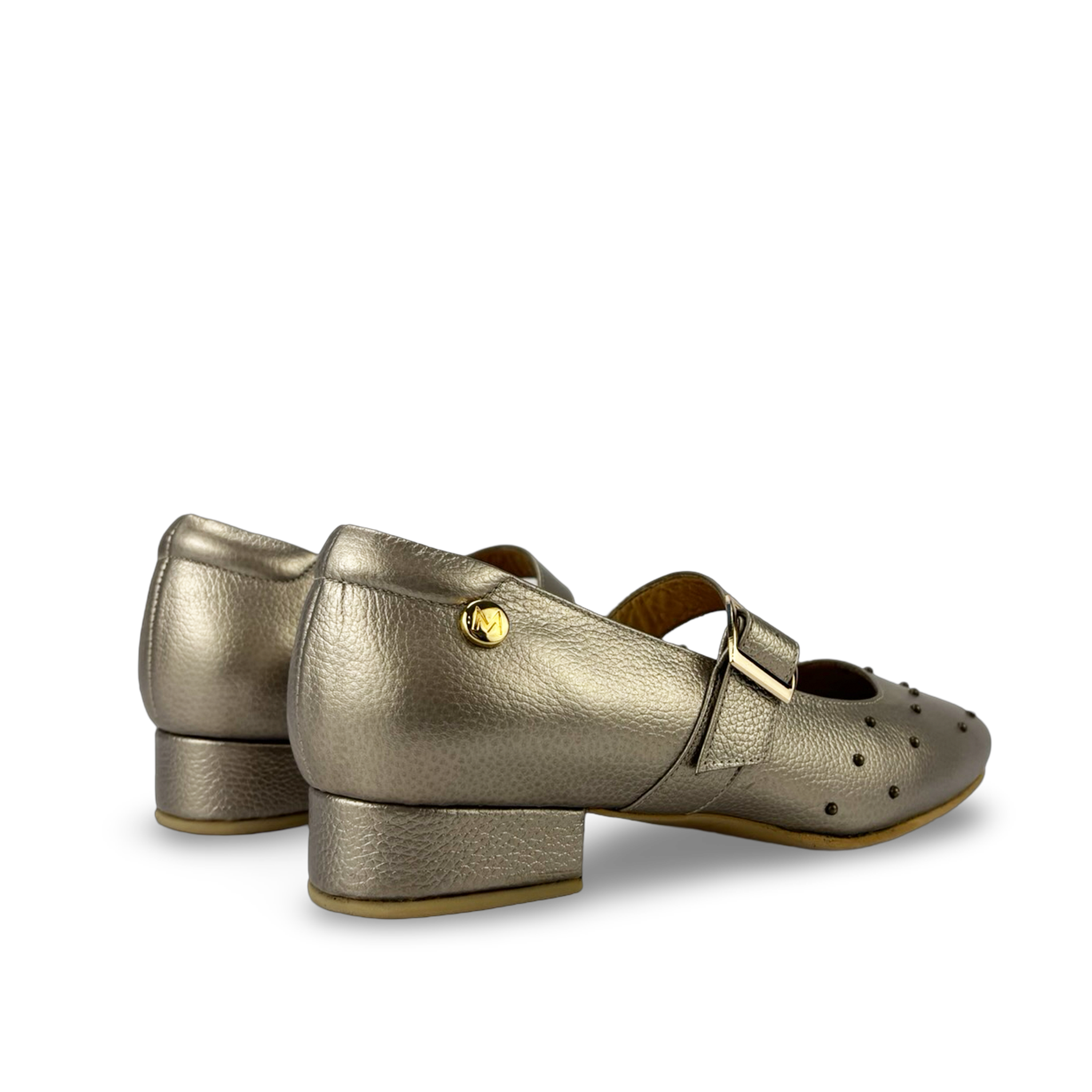Zapato plano para mujer elaborado en 100% cuero vacuno liso, con aplique metálico dorado y taches decorativos que aportan un toque elegante y moderno. Su tacón bajo de 2 cm y hebilla ajustable brindan comodidad y ajuste perfecto para el uso diario.