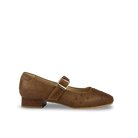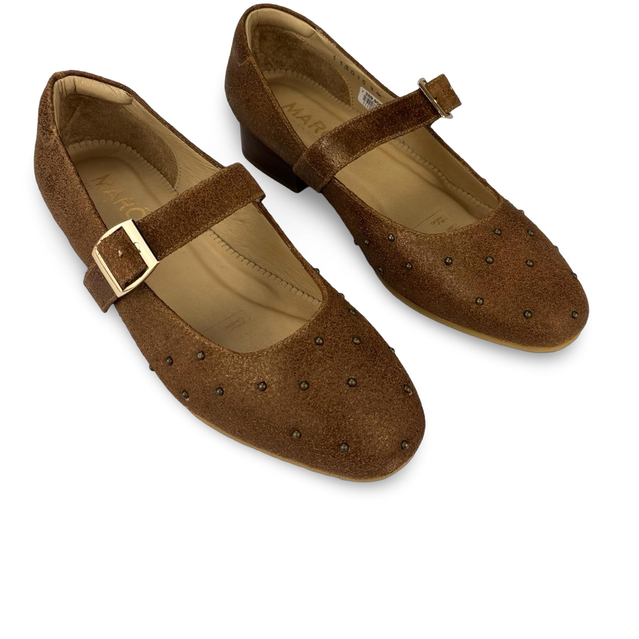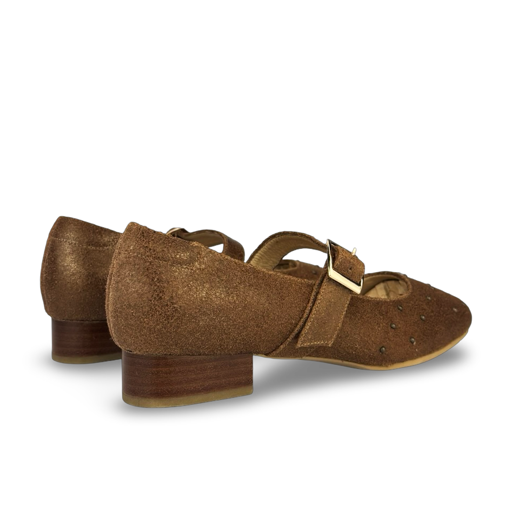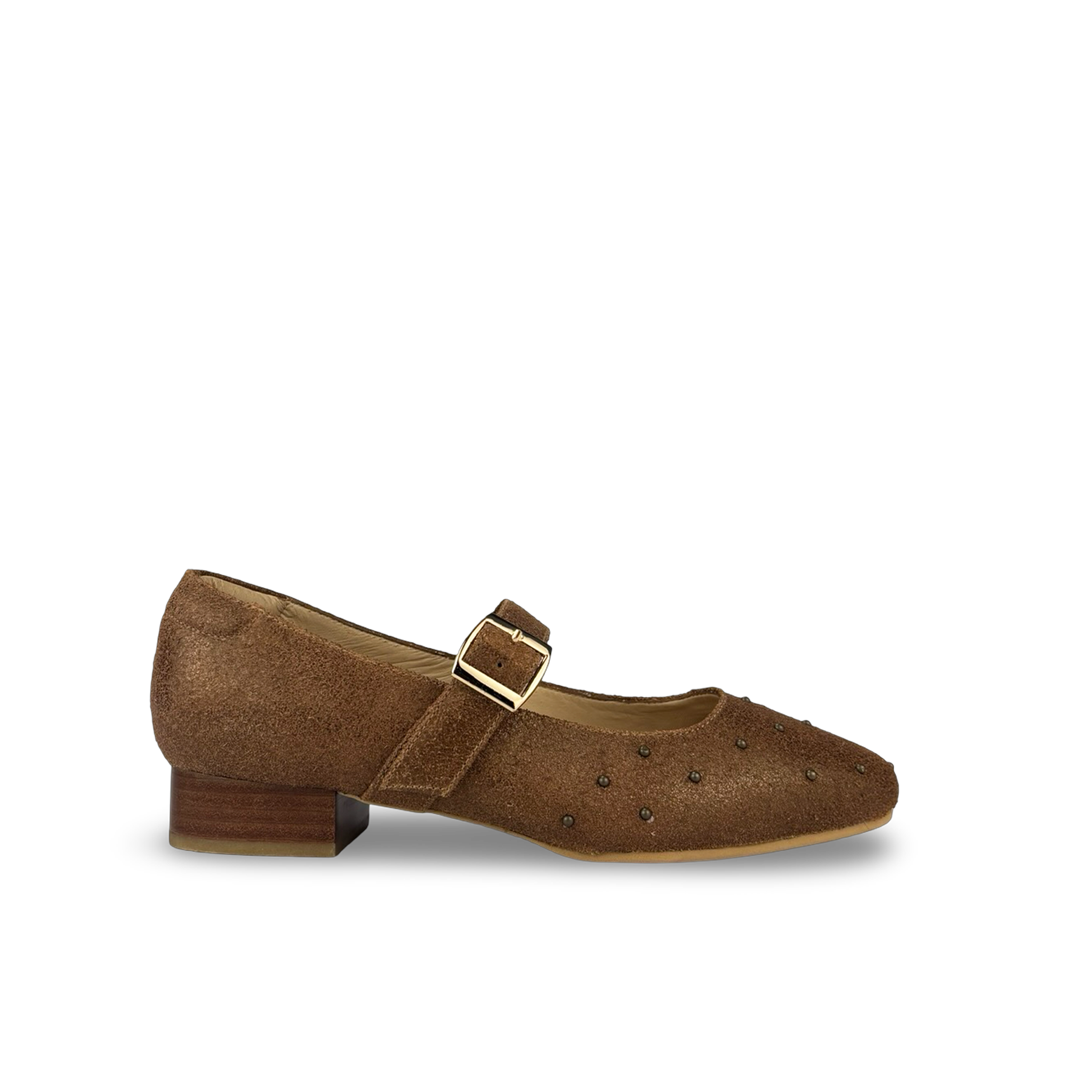 Zapato plano para mujer elaborado en 100% cuero vacuno gamuza, con aplique metálico dorado y taches decorativos que aportan un toque elegante y moderno. Su tacón bajo de 2 cm y hebilla ajustable brindan comodidad y ajuste perfecto para el uso diario.