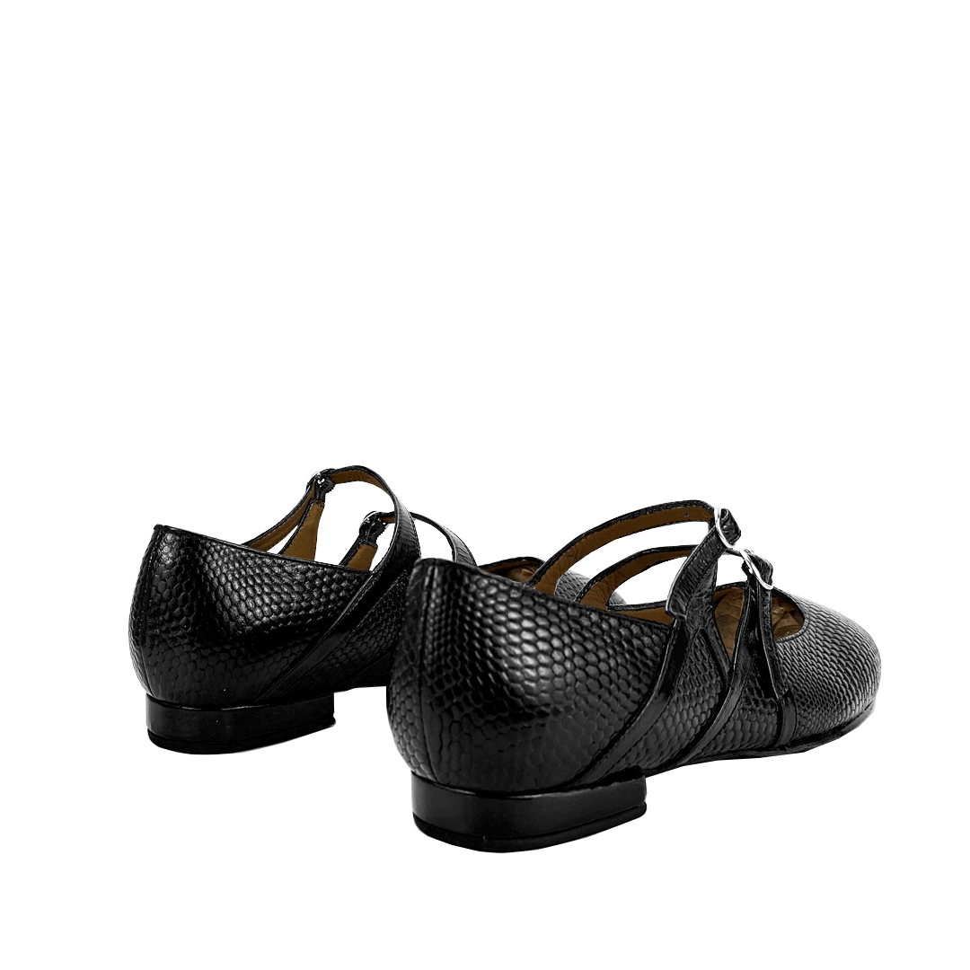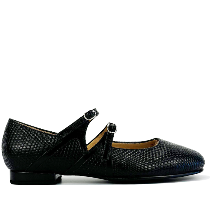 Mocasín tipo bailarina para Mujer Casual/ formal; en cuero vacuno; punta redonda terminación cuero grabado; 2 trabilla en empeine con diseño; tacón bajo; marca Maróc