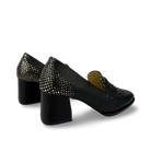 Tacón estilo mocasín para mujer elaborado en cuero vacuno liso y grabado, con antifaz decorativo en el empeine que realza su diseño clásico y sofisticado.