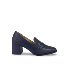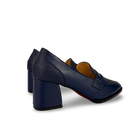 Tacón estilo mocasín para mujer elaborado en cuero vacuno liso y grabado, con antifaz decorativo en el empeine que realza su diseño clásico y sofisticado.