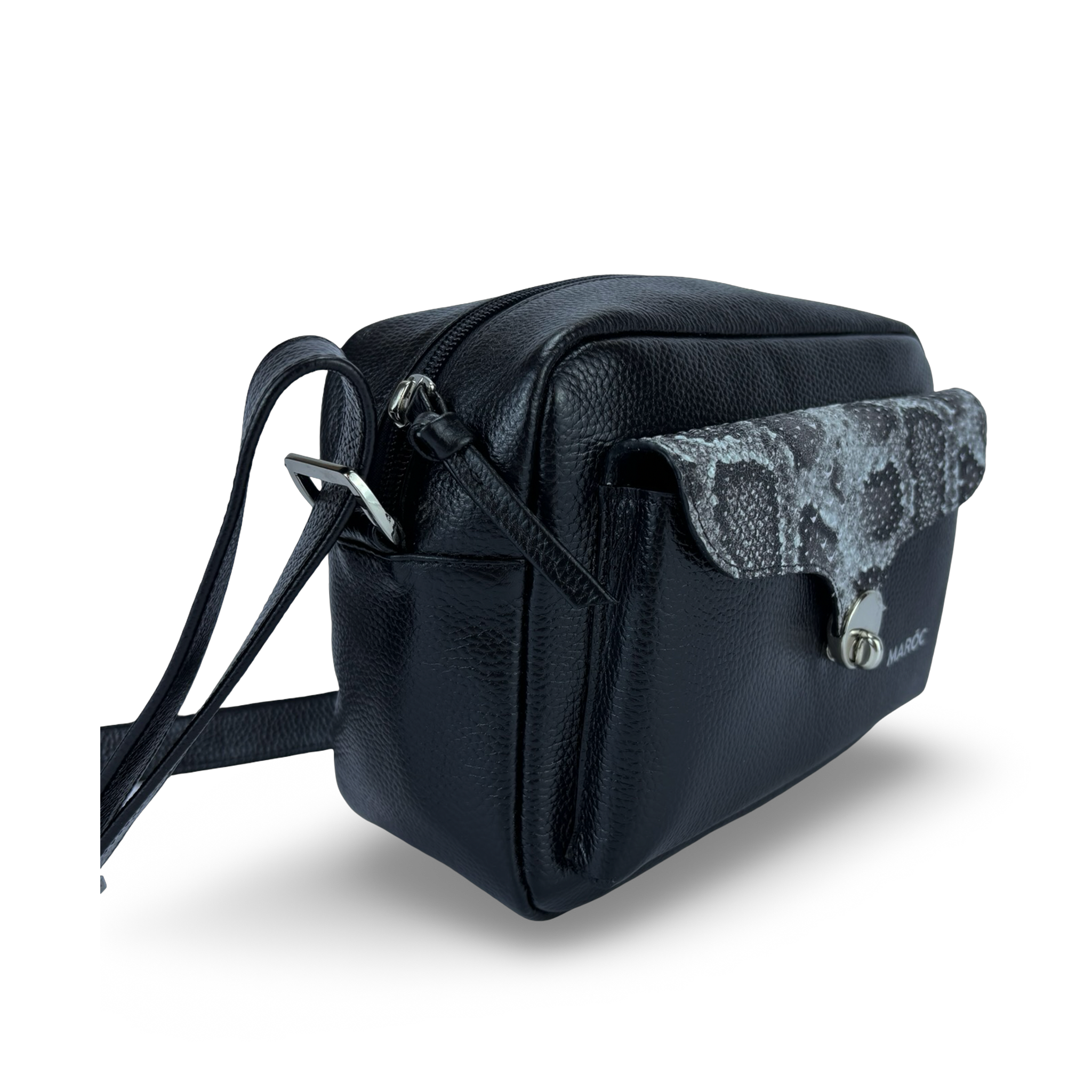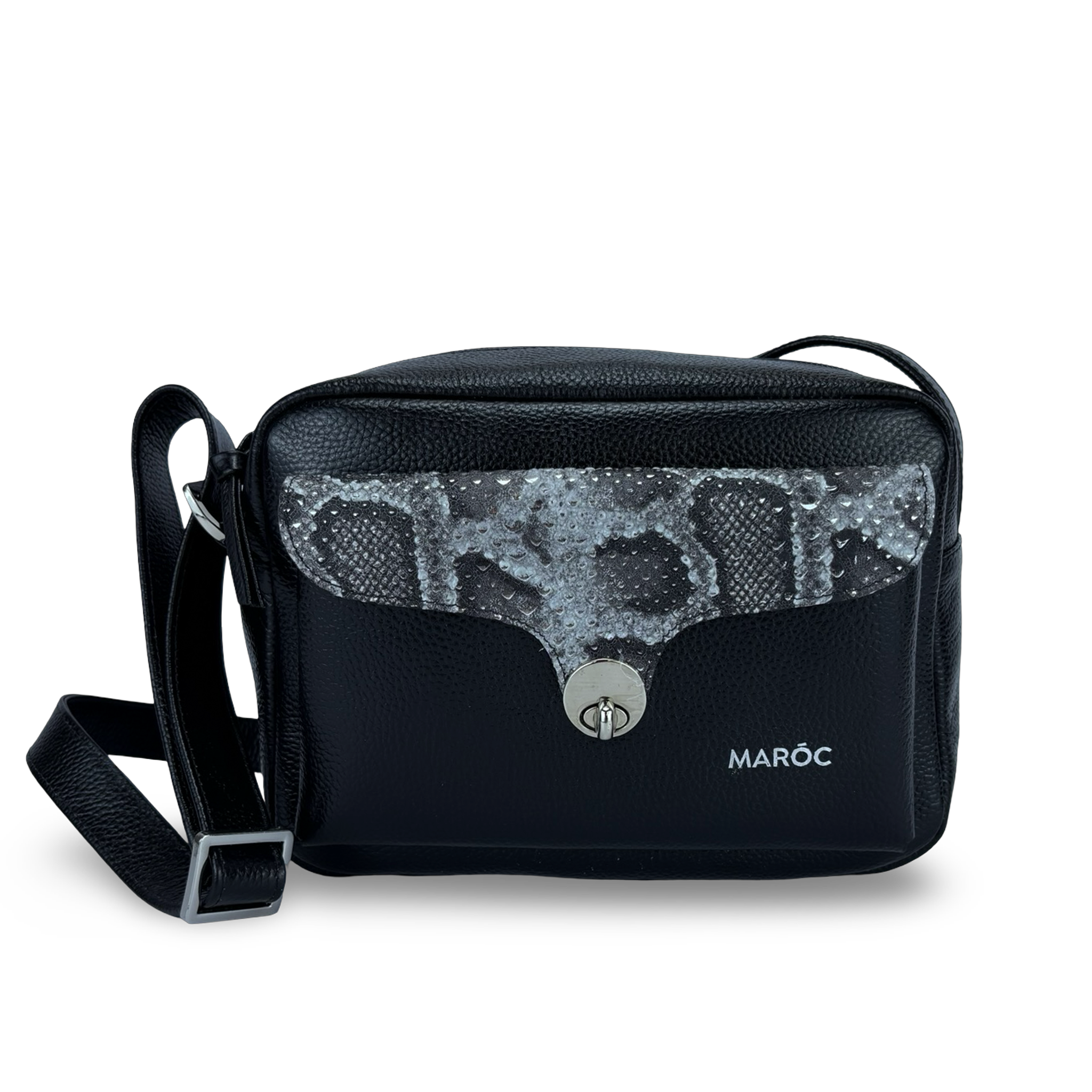 El bolso manos libres para mujer con solapa en cuero grabado de Maroc combina diseño clásico y practicidad moderna. Fabricado en 100% cuero vacuno grabado y liso, ofrece una estructura compacta pero funcional con varios compartimentos internos y externos para mantener tus esenciales organizados.