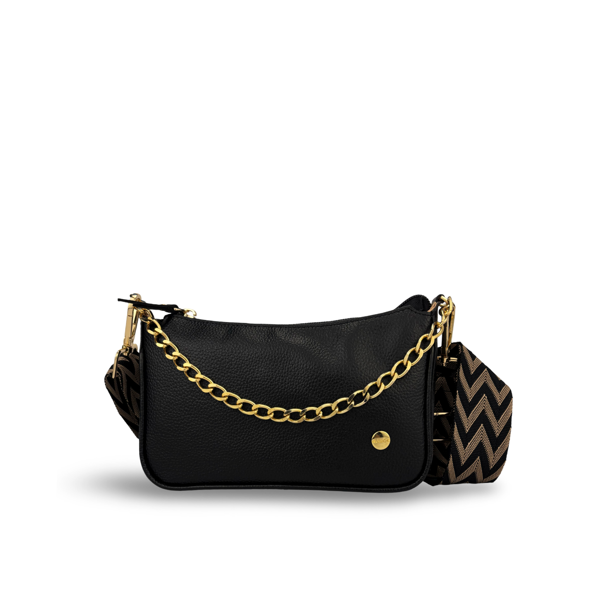 - Tipo: Bolso manos libres para mujer con aplique metálico dorado logo marca Maroc en la parte frontal del bolso, lo puedes llevar cruzado o colgado con cadena al hombro