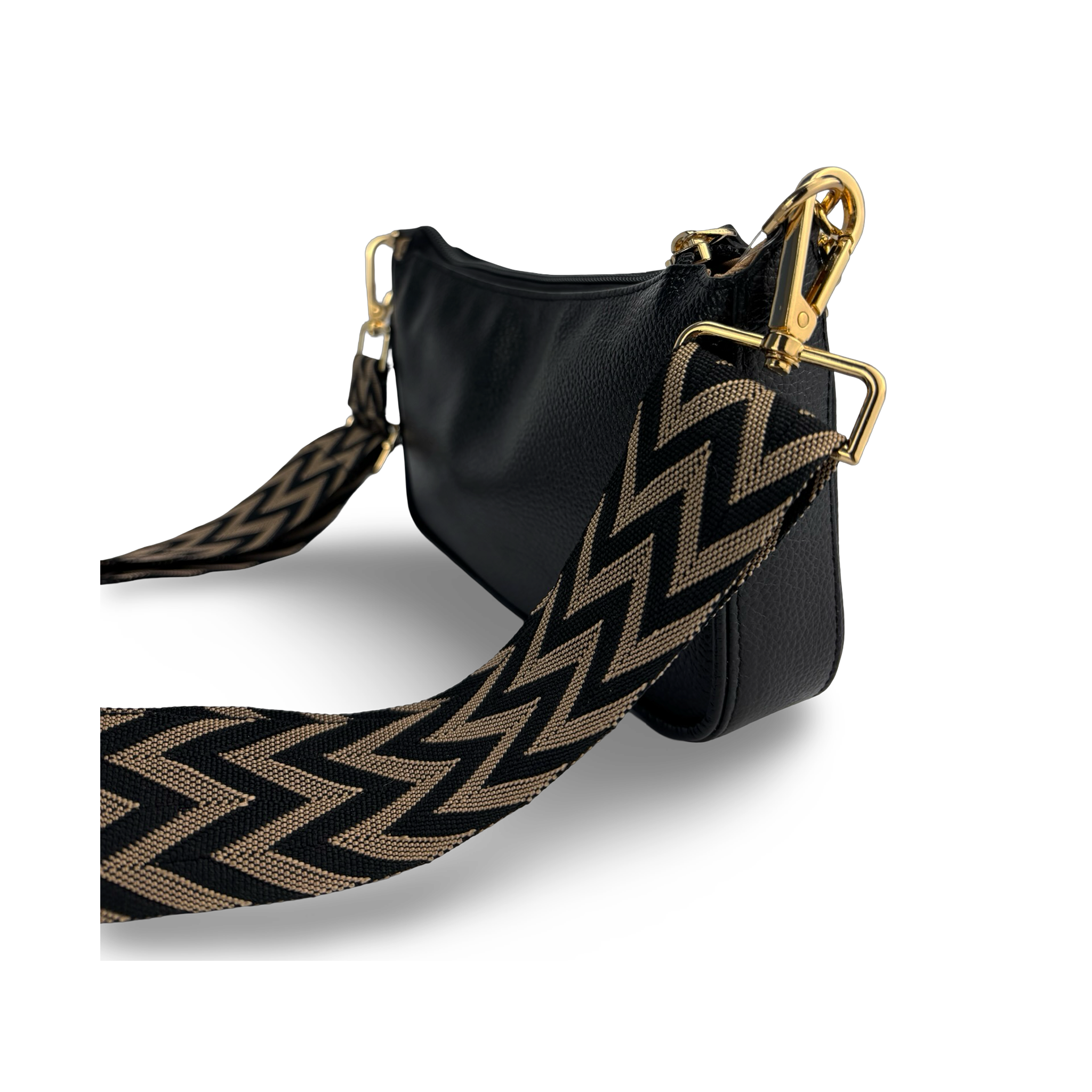 El aplique dorado con el logo de la marca y la correa ancha cruzada completan su diseño contemporáneo.