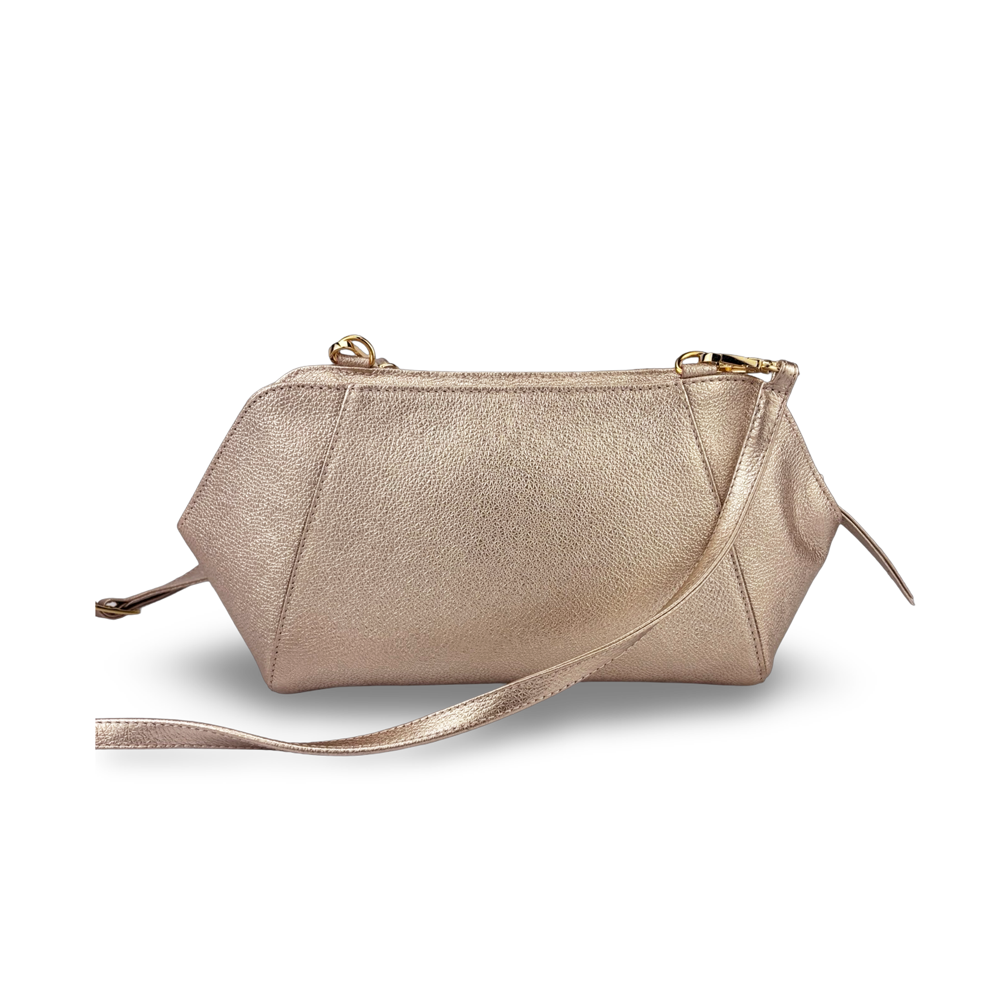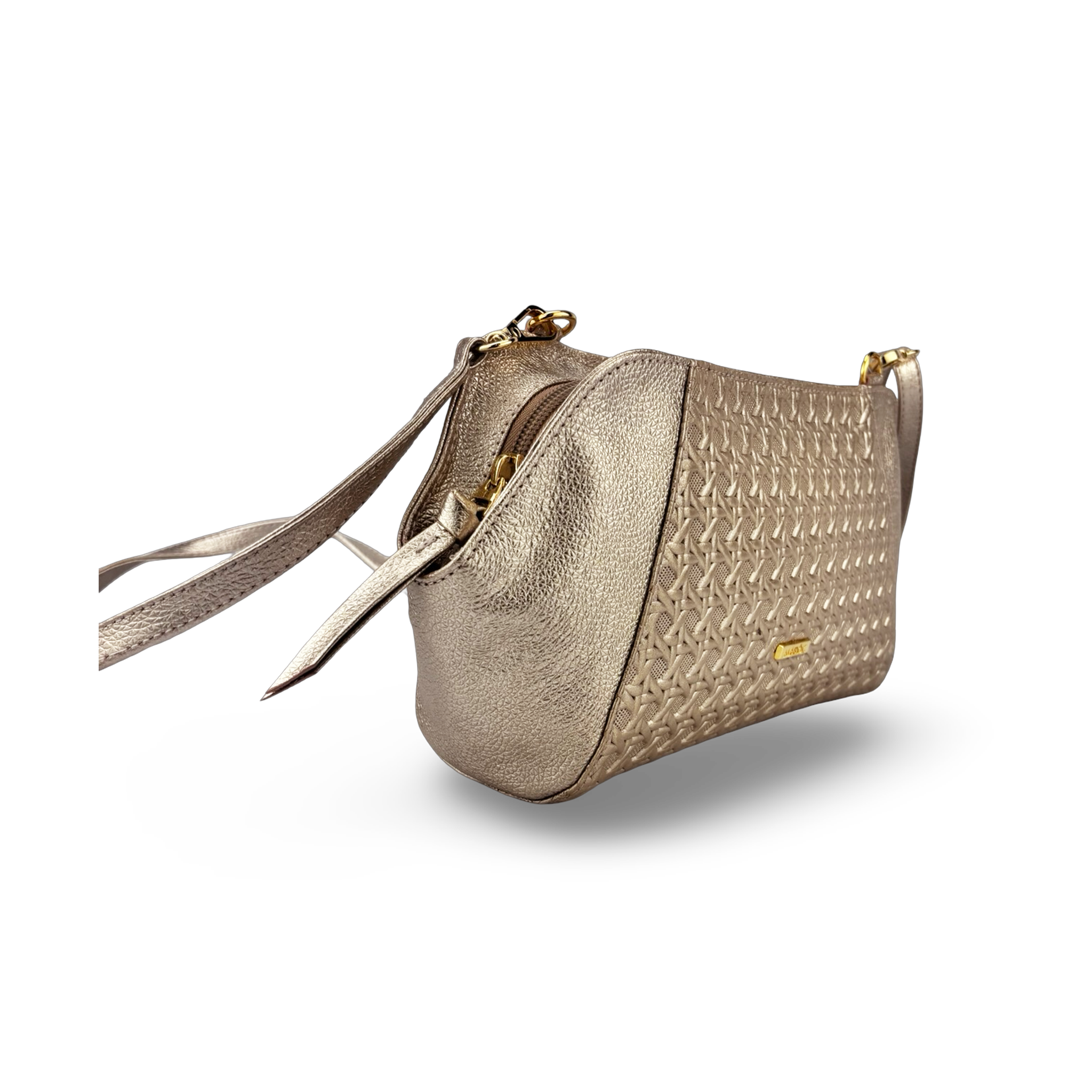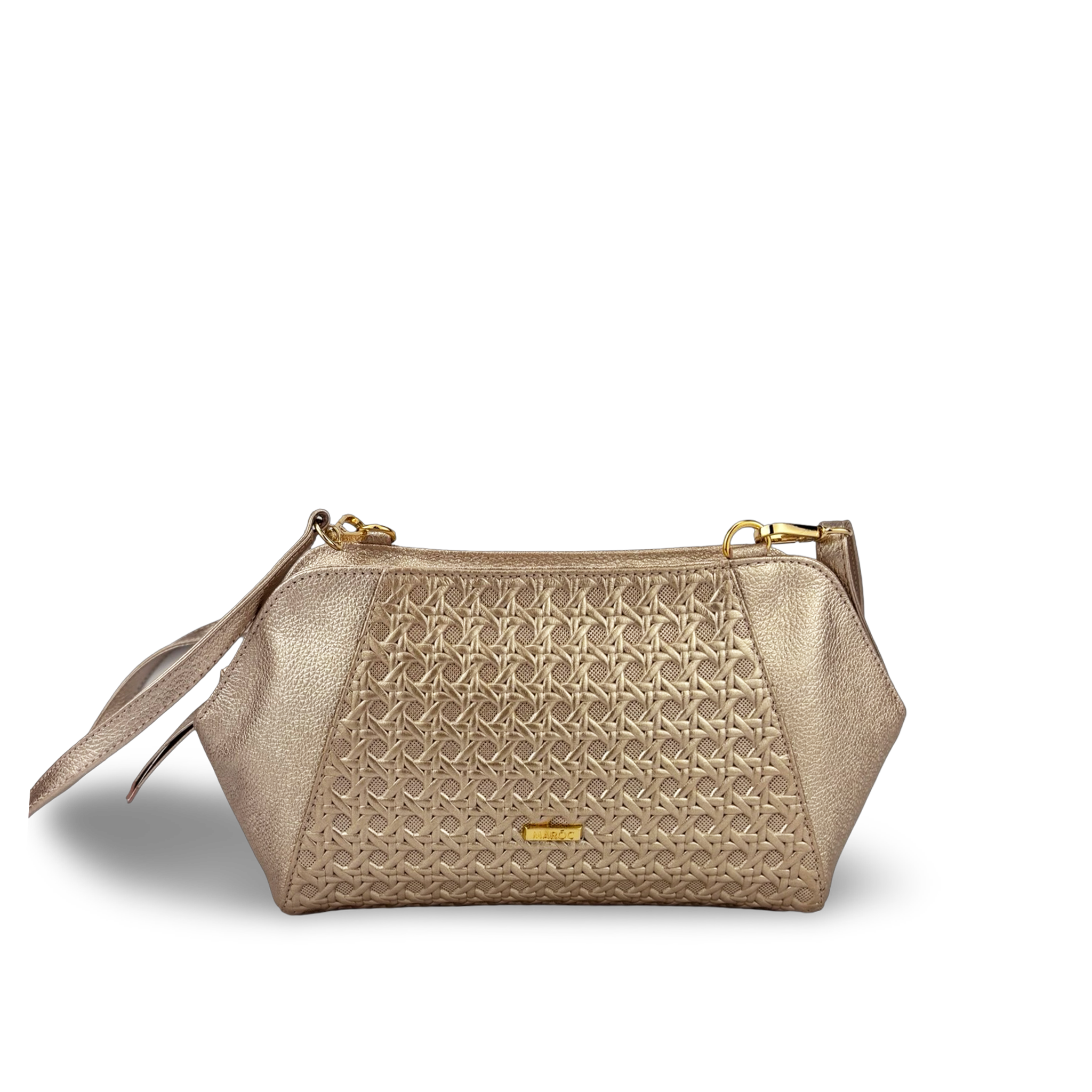Bolso manos libres tipo fiesta para mujer elaborado en cuero vacuno grabado y metalizado, con aplique metálico dorado del logo MAROC en la parte frontal que aporta elegancia y distinción.