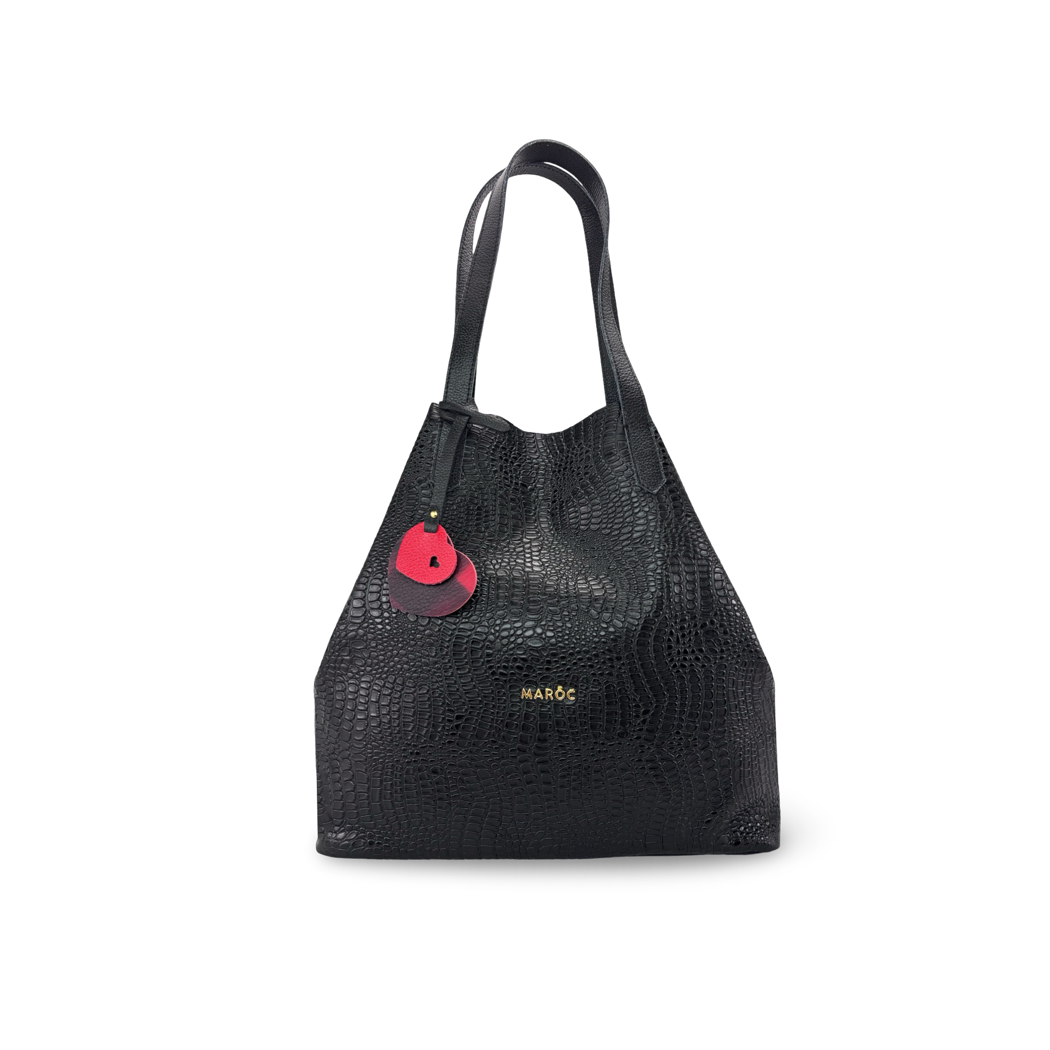 Este bolso Tote, elegante y moderno está elaborado en 100% cuero vacuno grabado, con herrajes en zamak que aportan durabilidad y estilo premium. Su diseño incluye charm decorativo de corazones y herraje frontal con la marca MAROC, que realzan su sofisticación. Con dimensiones aproximadas de 30 x 30 x 15 cm, cuenta con compartimento interno para guardar el celular y mosquetones de ajuste que permiten transformar la estructura del bolso según tu estilo y necesidad. Hecho en Colombia, combina funcionalidad, versatilidad y diseño exclusivo.