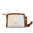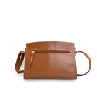 Bolso manos libres para mujer en diseño bicolor (coñac y arena) elaborado en 100% cuero vacuno grabado y liso, con aplique metálico del logo Maroc en la parte frontal. Cuenta con un compartimento principal, un bolsillo interno y un compartimento externo con cremallera. Incluye correa ajustable para cruzar, combinando estilo y funcionalidad.