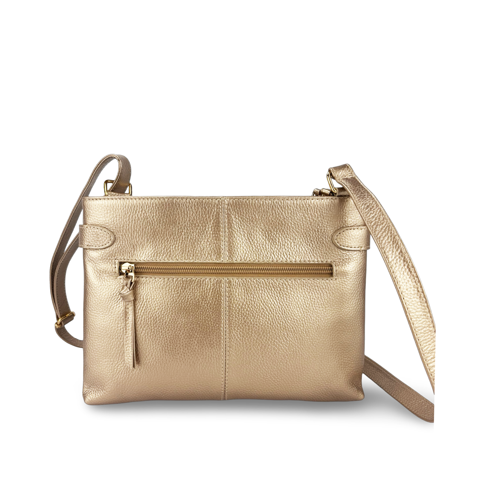 Herrajes Dorados: Todos los herrajes metálicos, incluyendo las cremalleras y los ajustadores de la correa, están en un elegante tono dorado que complementa a la perfección el color oro rosado del cuero.