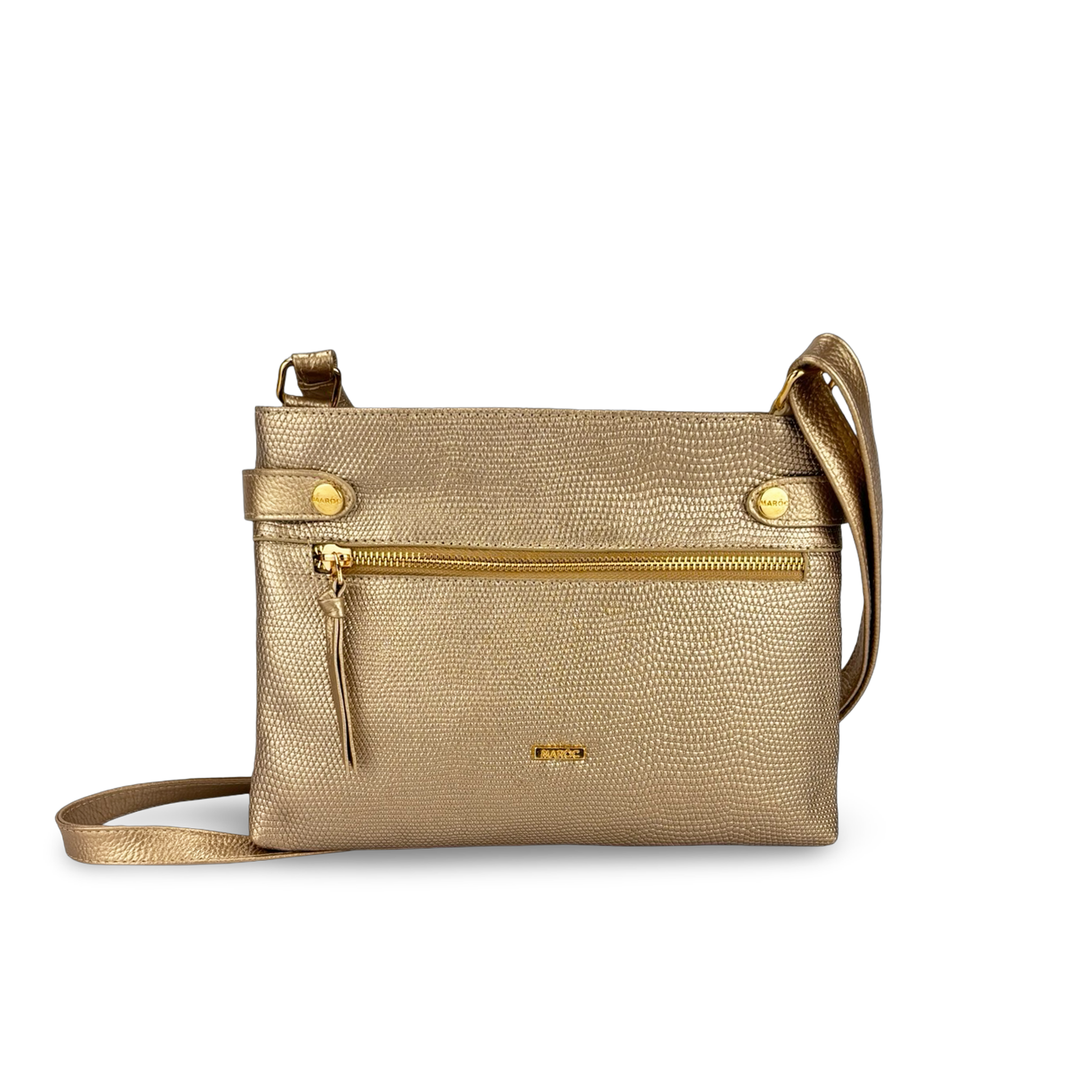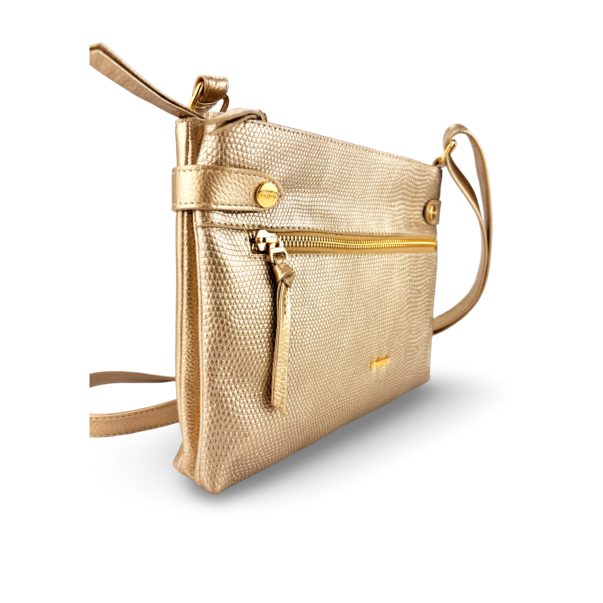 Diseño Exquisito y Moderno: La parte frontal del bolso presenta una elegante textura grabada tipo "lizard" o "reptil" en el mismo tono metálico, contrastando armoniosamente con el cuero liso de la parte trasera, lo que le confiere un estilo único y contemporáneo.