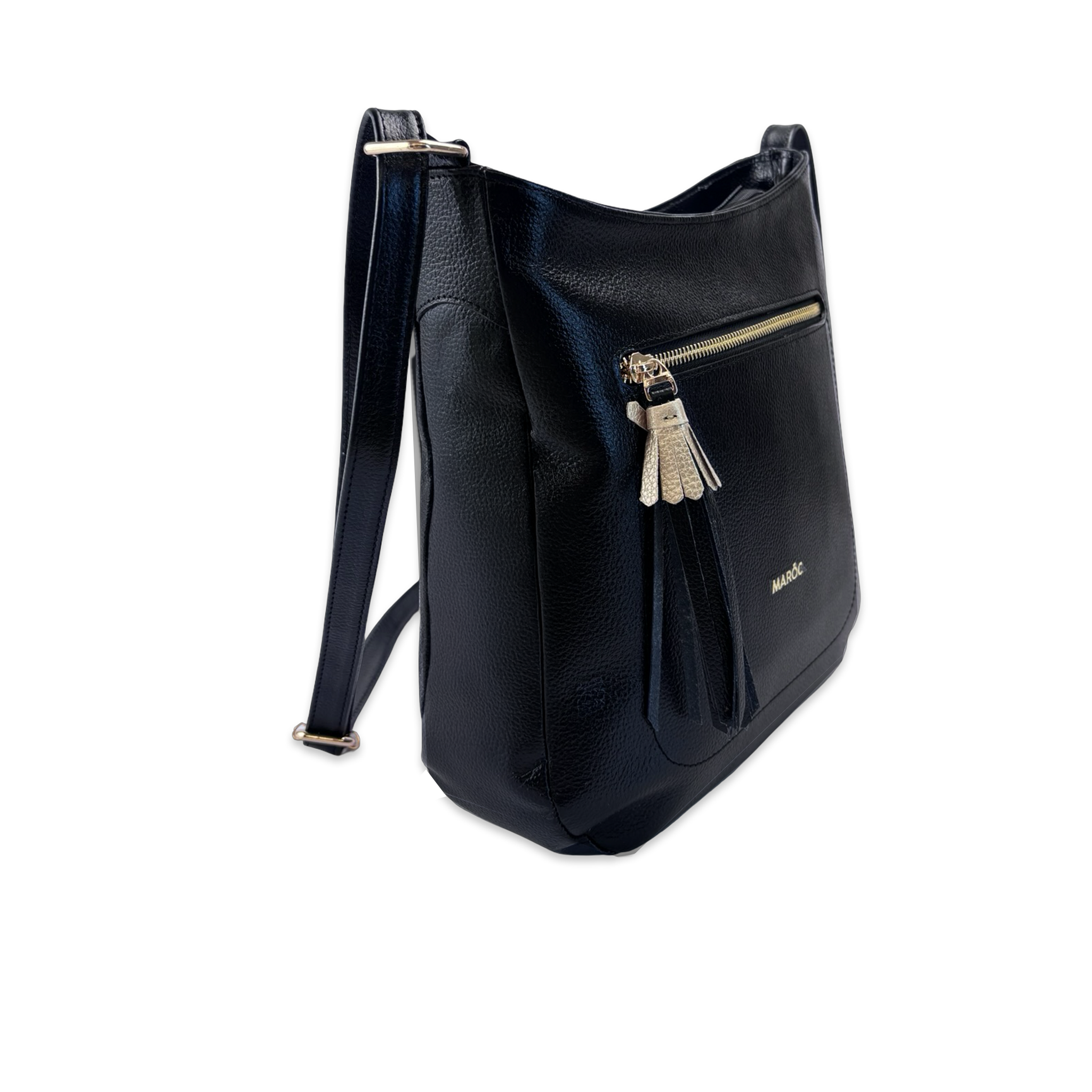 Bolso manos libres para mujer con diseño funcional y elegante, adornado con un aplique metálico grabado del logo MAROC en la parte frontal. Su estructura es amplia y ligera, ideal para acompañarte en el día a día. Cuenta con varios compartimentos internos y externos, perfectos para mantener todo organizado: desde tu celular y llaves hasta tus esenciales de trabajo. Te va a encantar porque combina practicidad y estilo con el toque distintivo de la marca. Dimensiones aproximadas: Alto 24 cm x Ancho 22 cm x Fondo 8 cm.
