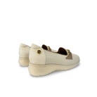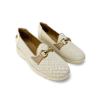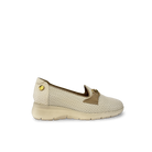 Mocasín casual para mujer en 100% cuero vacuno grabado y troquelado, con aplique metálico tipo estribo en la capellada y detalles dorados laterales con el logo MAROC. Su diseño slip-on y suela de caucho de 4 cm brindan comodidad, estilo y un look sofisticado ideal para ocasiones casuales o semiformales.