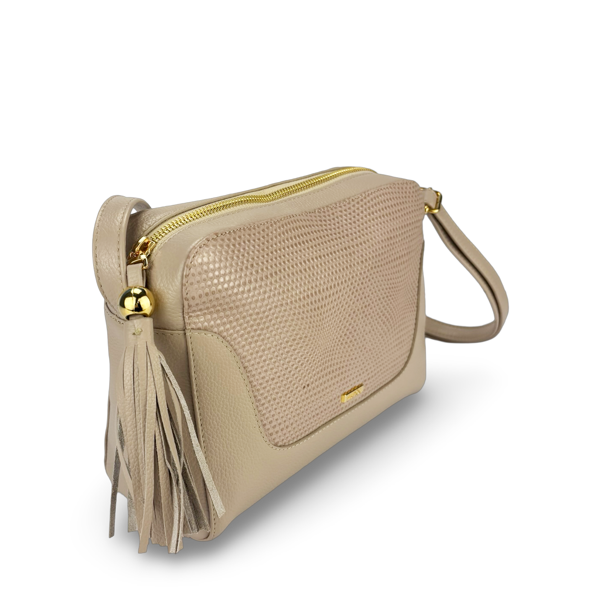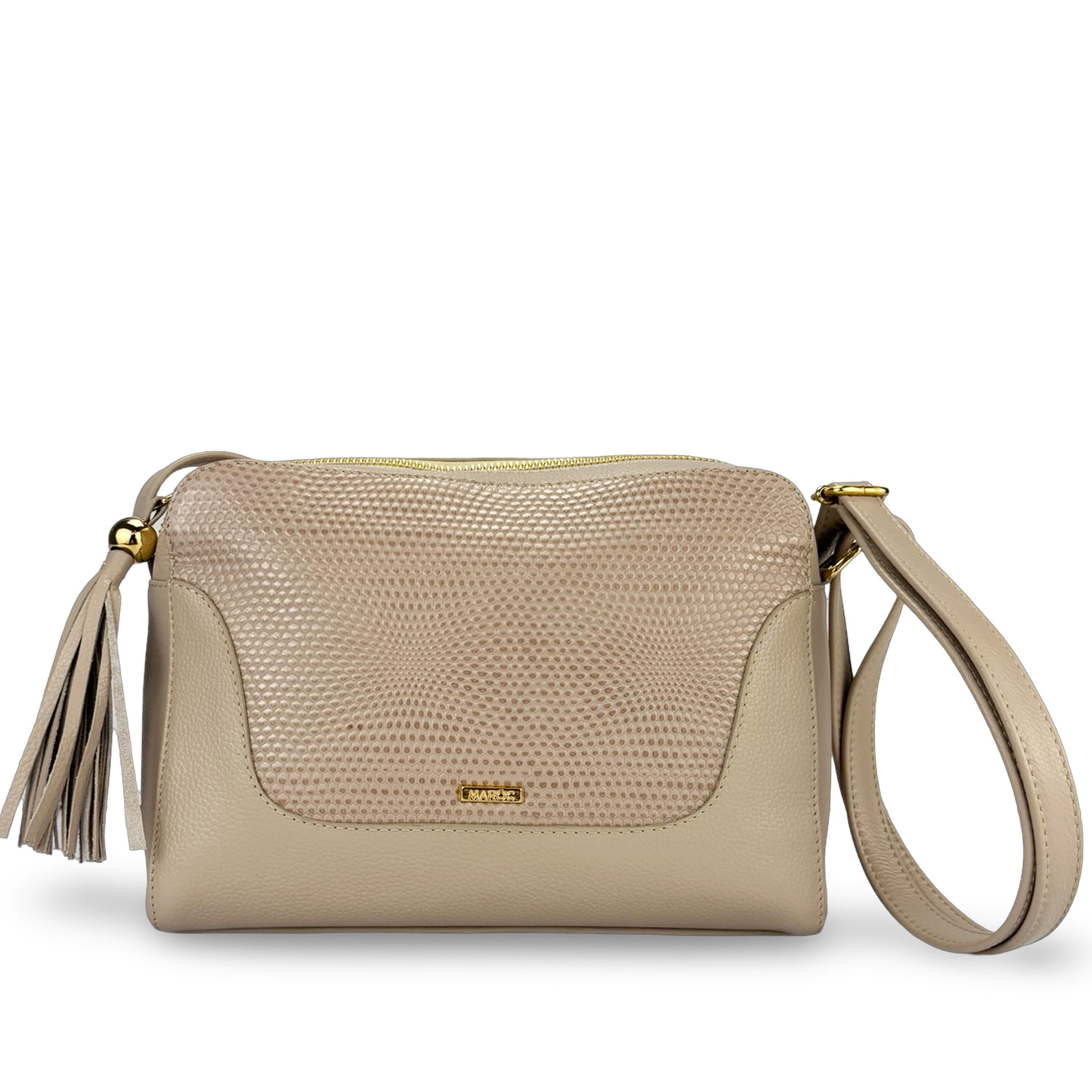 Bolso manos libres en 100% cuero vacuno, combinación de texturas grabado y liso, ideal para acompañar tus looks diarios con un toque sofisticado. Su diseño incluye aplique metálico dorado con logo MAROC y borla decorativa en el slider, aportando elegancia y distinción. Cuenta con correa graduable, amplio compartimento principal y bolsillos con cremallera internos y externos para mayor organización. Dimensiones aproximadas: Alto 19cm x Ancho 24.5cm x Fondo 8cm.