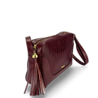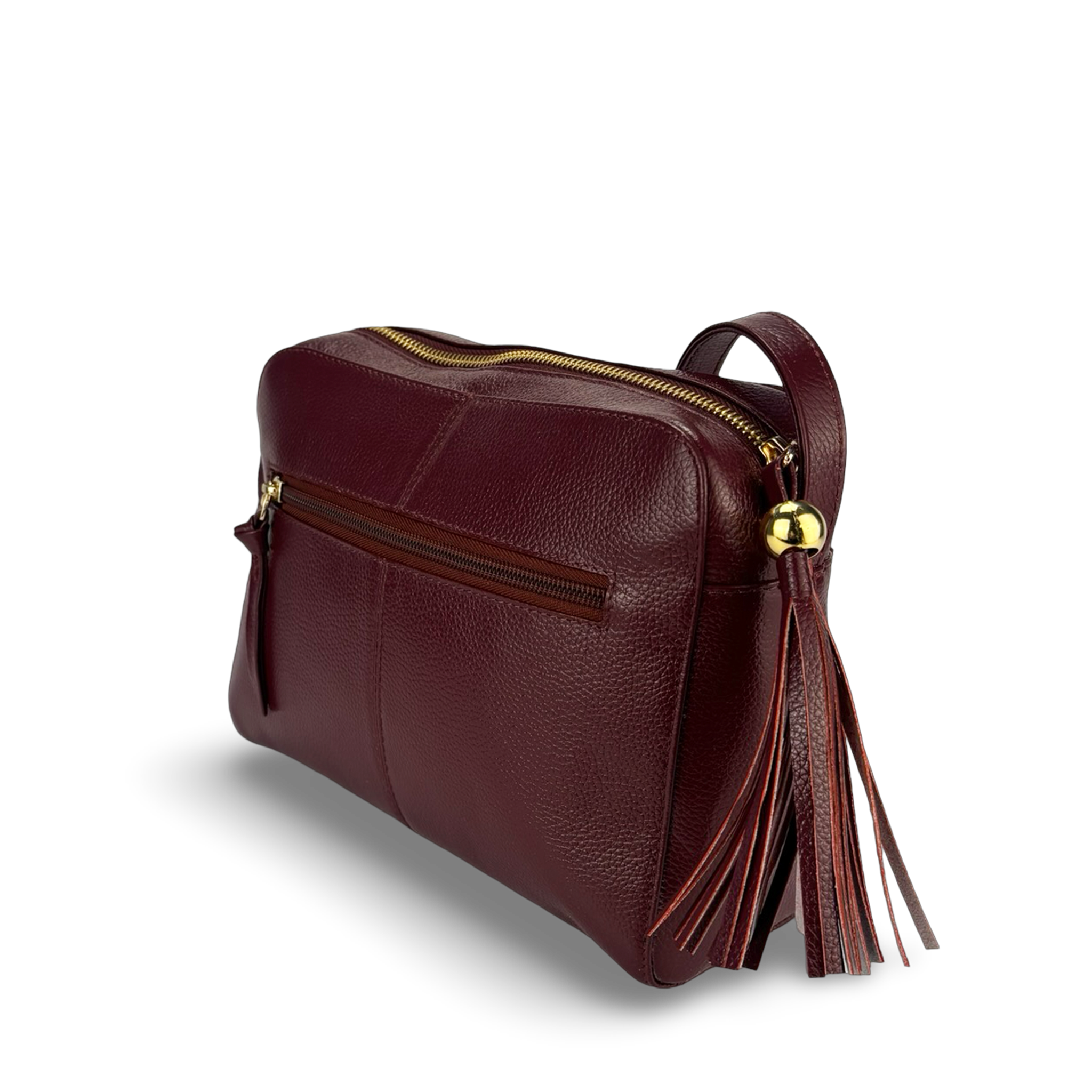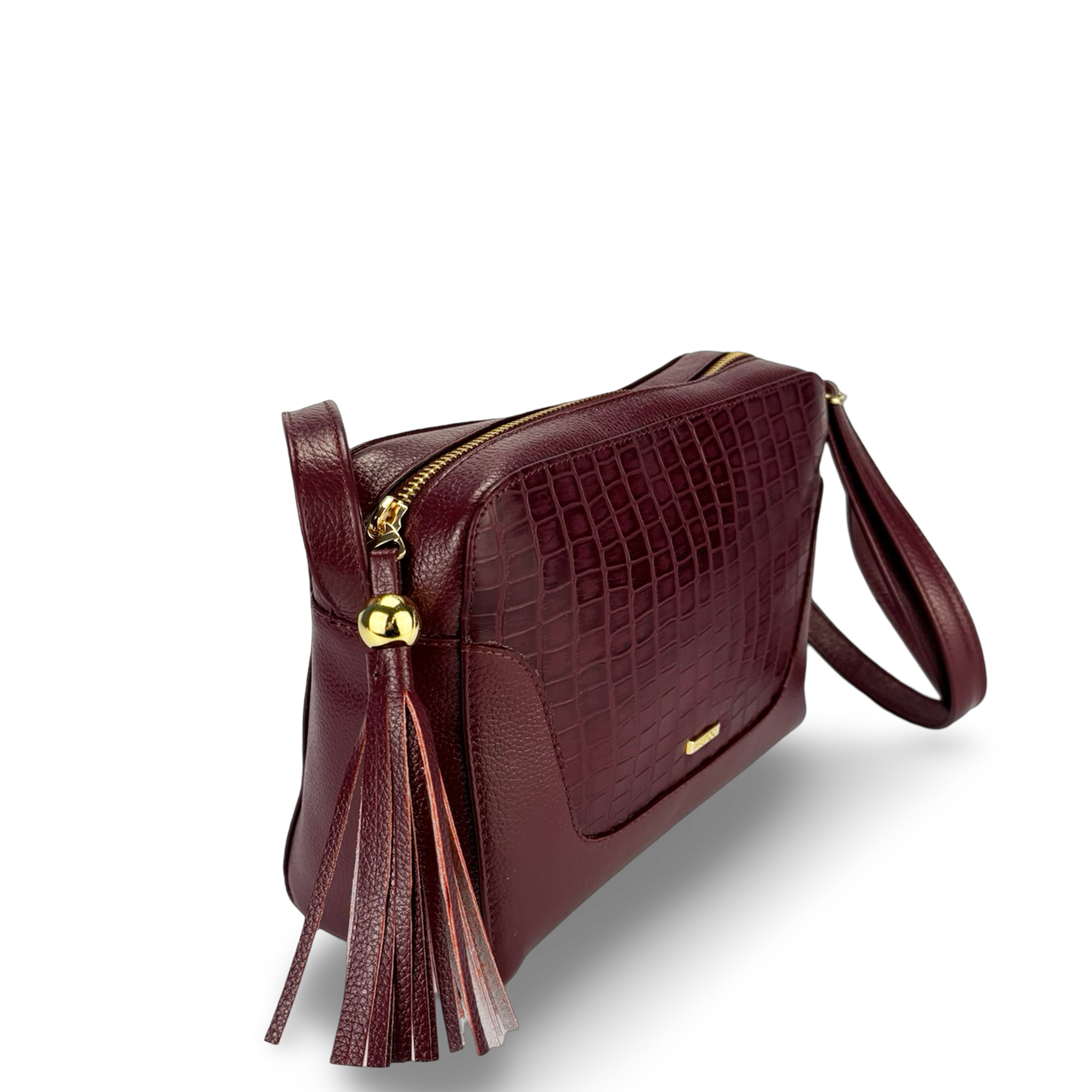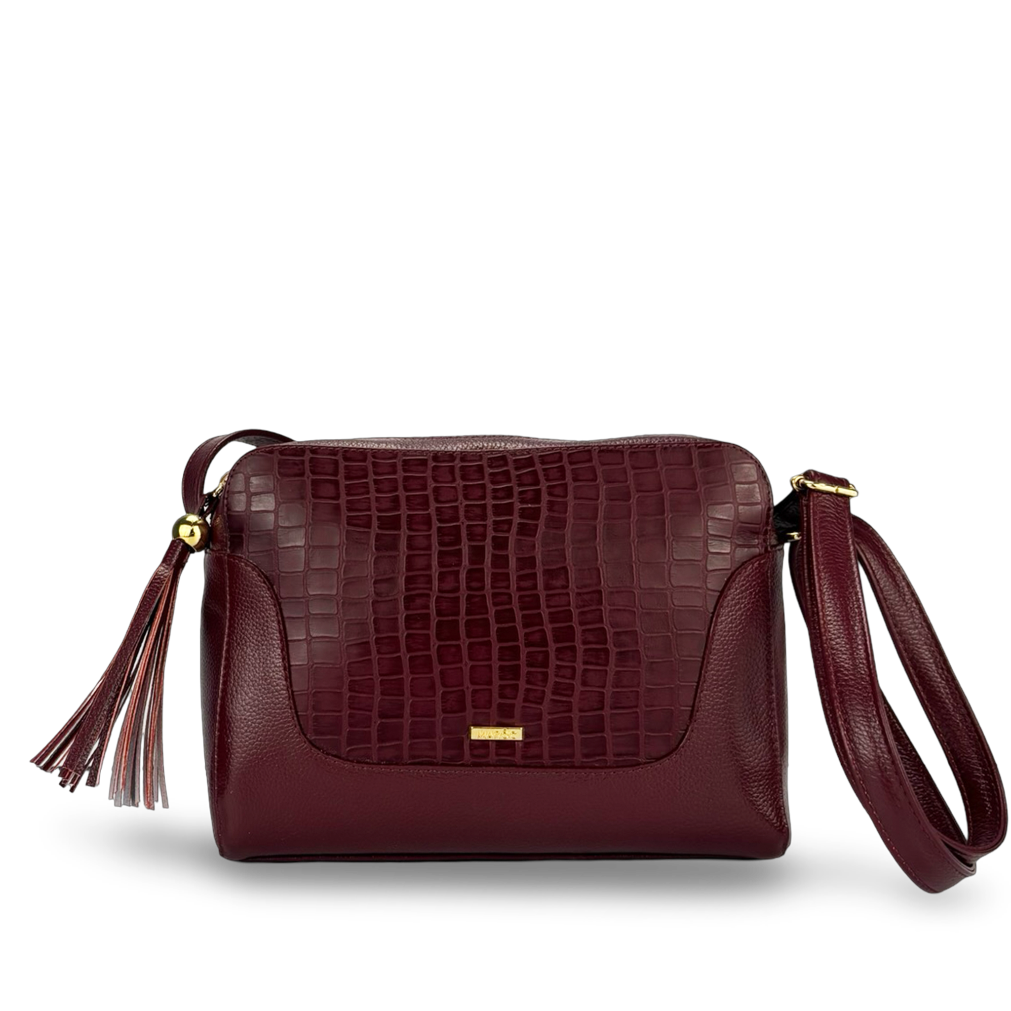 Bolso manos libres en 100% cuero vacuno, combinación de texturas grabado y liso, ideal para acompañar tus looks diarios con un toque sofisticado. Su diseño incluye aplique metálico dorado con logo MAROC y borla decorativa en el slider, aportando elegancia y distinción. Cuenta con correa graduable, amplio compartimento principal y bolsillos con cremallera internos y externos para mayor organización. Dimensiones aproximadas: Alto 19cm x Ancho 24.5cm x Fondo 8cm.