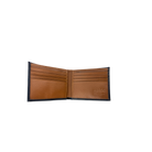 Billetera para hombre bicolor azul miel elaborada en 100% cuero vacuno liso y grabado, combinando elegancia y funcionalidad. Su diseño delgado y moderno incorpora tecnología de bloqueo R-FID, que protege tus tarjetas contra escaneos no autorizados, brindándote seguridad y tranquilidad en tu día a día.