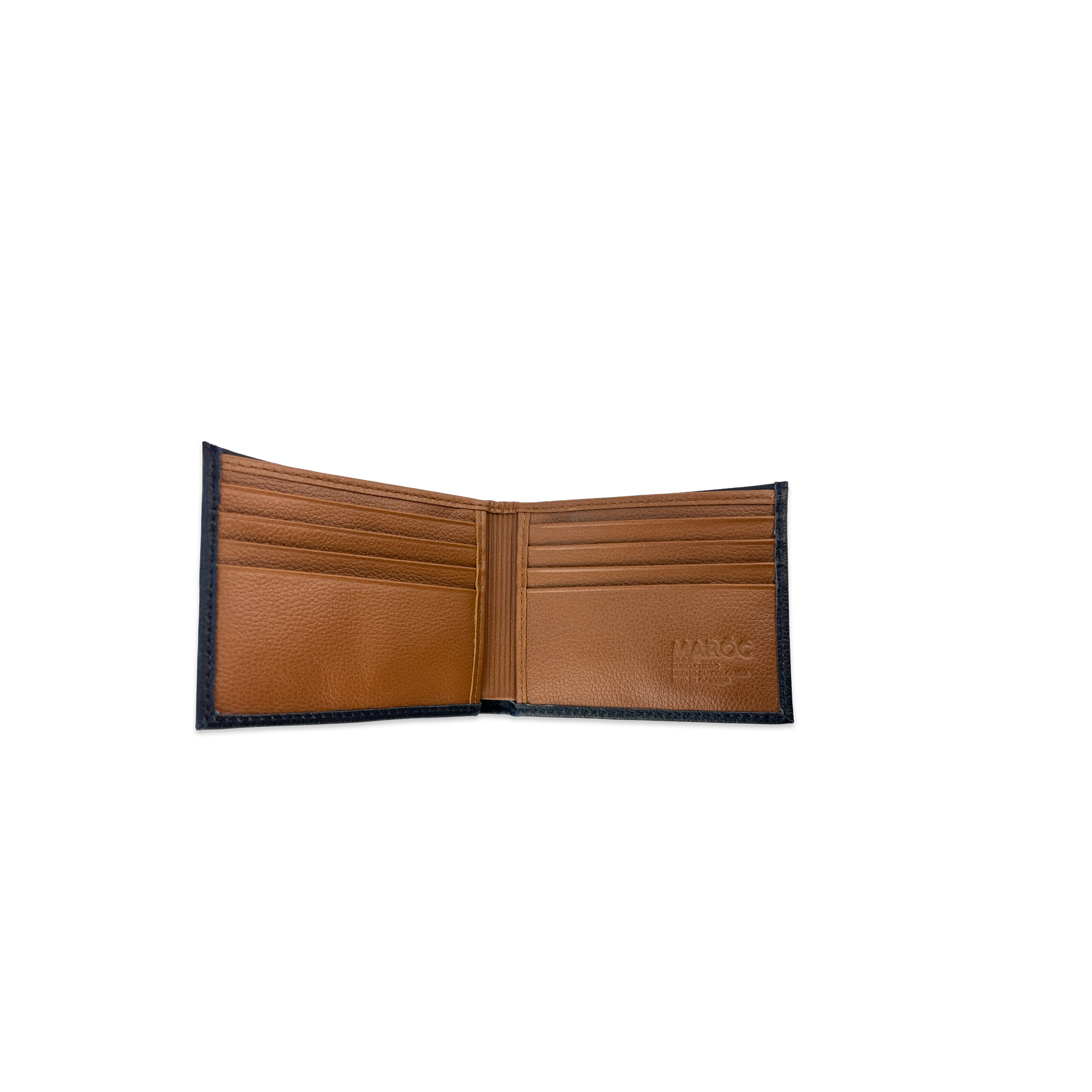 - Tipo: Billetera para hombre Bicolor azul miel, con bloqueo R-FID para asegurar tus tarjetas tiene el logo marca Maroc grabado en el lateral de la billetera