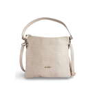 Bolso manos libres para mujer en cuero vacuno grabado con Dimensiones Aproximadas de (25 cm Alto x 26 cm Ancho x 8 cm Fondo, con aplique metálico dorado del logo Maroc. Versátil para llevar al hombro o cruzado, con compartimentos internos y externos y cierre con cremallera. Hecho en Colombia.