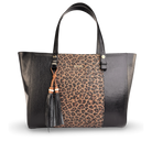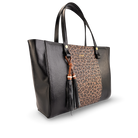 Bolso tipo tote para mujer elaborado en cuero vacuno grabado y liso, con borla decorativa y aplique metálico dorado del logo MAROC en la parte frontal que realzan su diseño sofisticado y funcional.