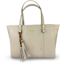 Bolso tipo tote para mujer elaborado en cuero vacuno grabado y liso, con borla decorativa y aplique metálico dorado del logo MAROC en la parte frontal que realzan su diseño sofisticado y funcional.