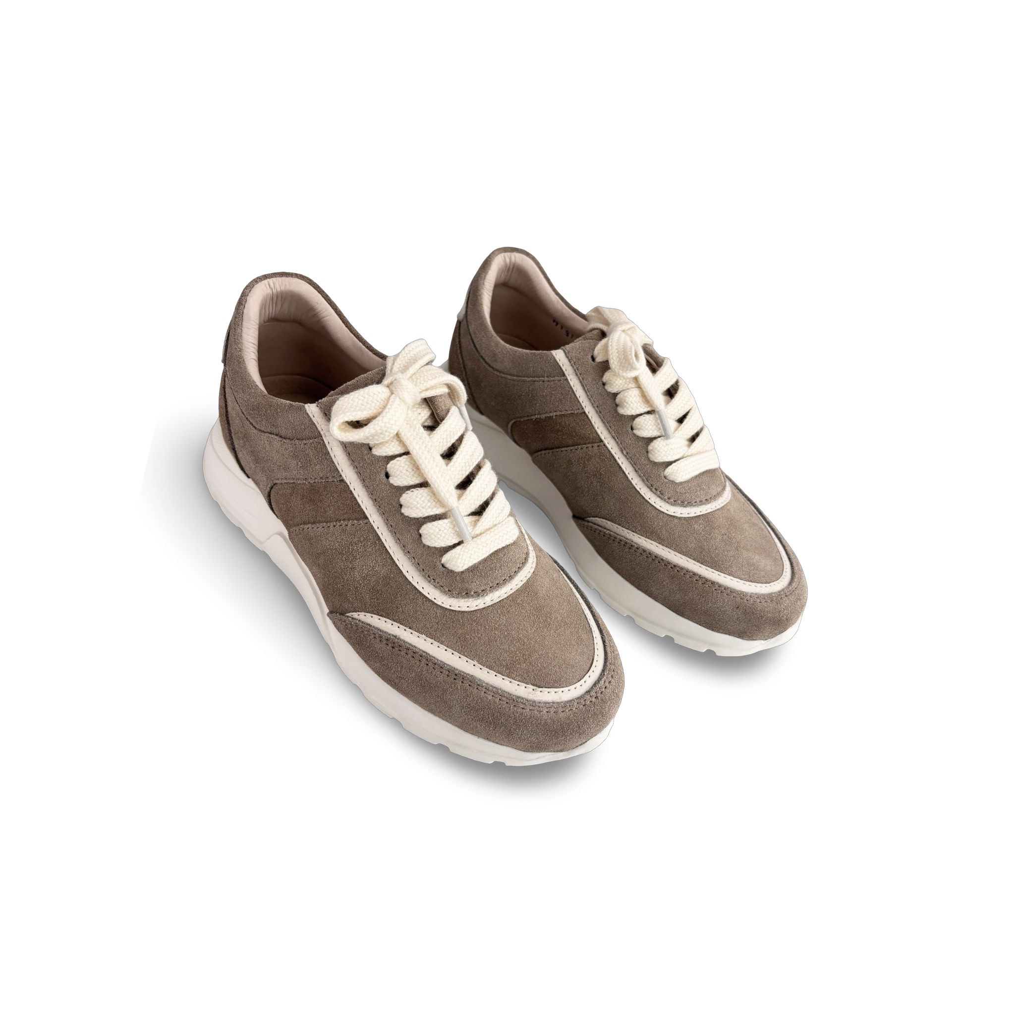 Materiales de calidad premium: Confeccionados en suave gamuza 100% colombiana, estos tenis ofrecen un tacto aterciopelado y una durabilidad excepcional. La combinación de tonos grises y detalles en color crema resalta la textura del material.