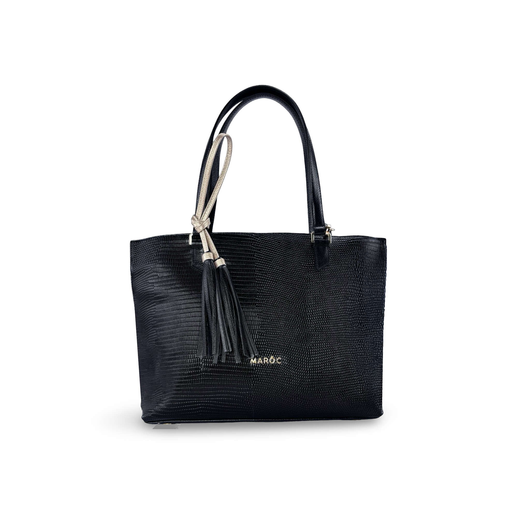 - Tipo: Bolso para mujer se puede llevar de dos formas, al hombro o cruzado tiene aplique metálico dorado en la parte frontal del bolso logo marca Maroc con 4 zapatas en la base para evitar contacto directo con el suelo