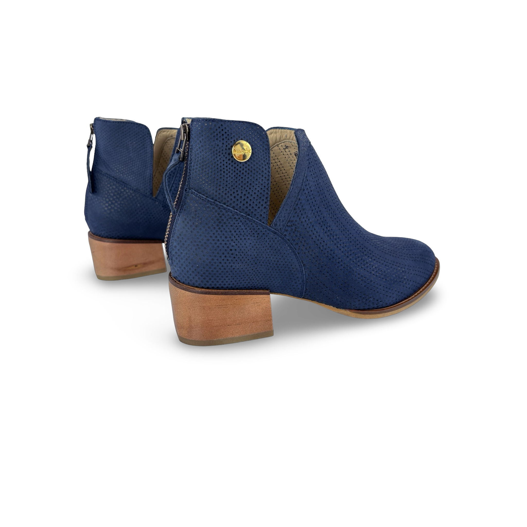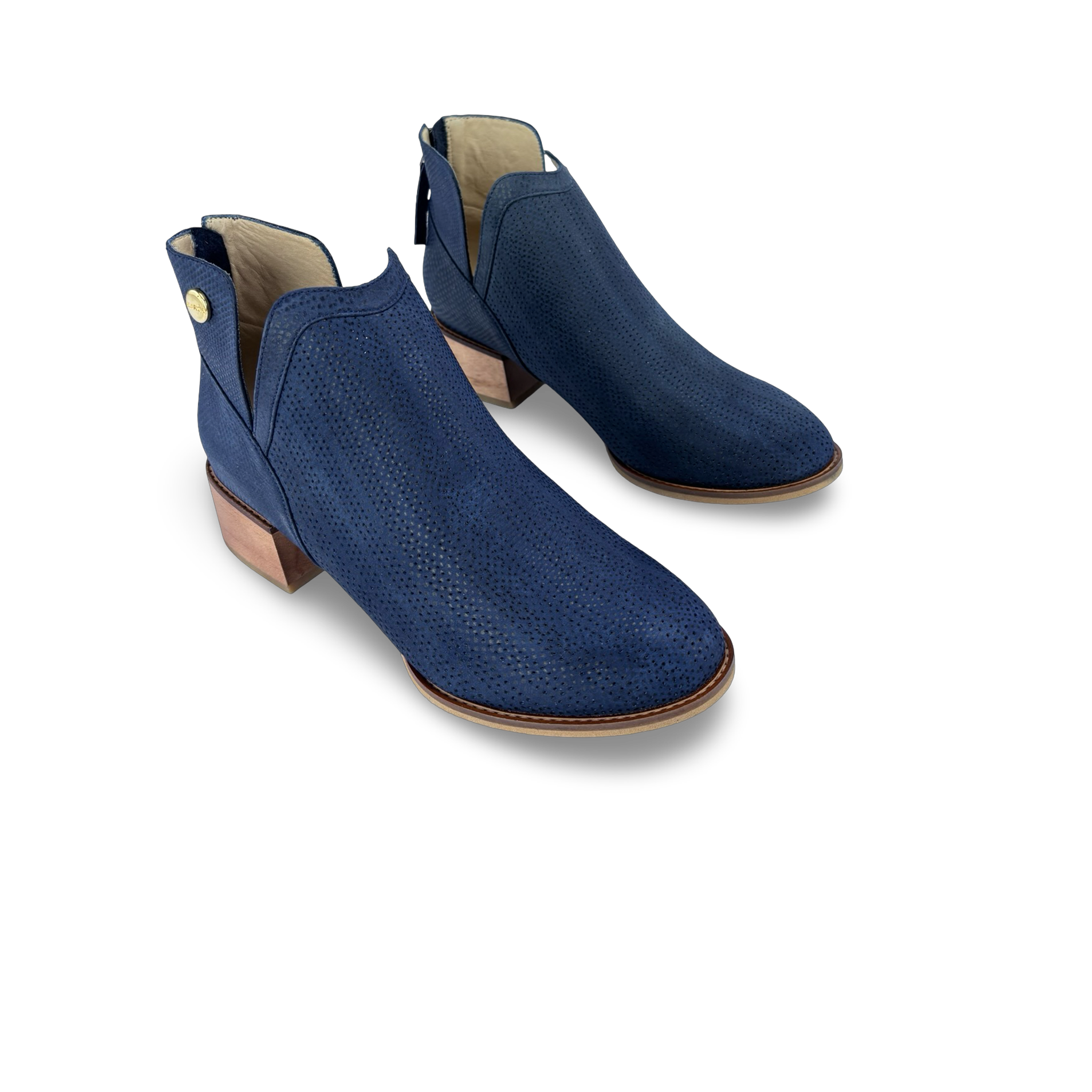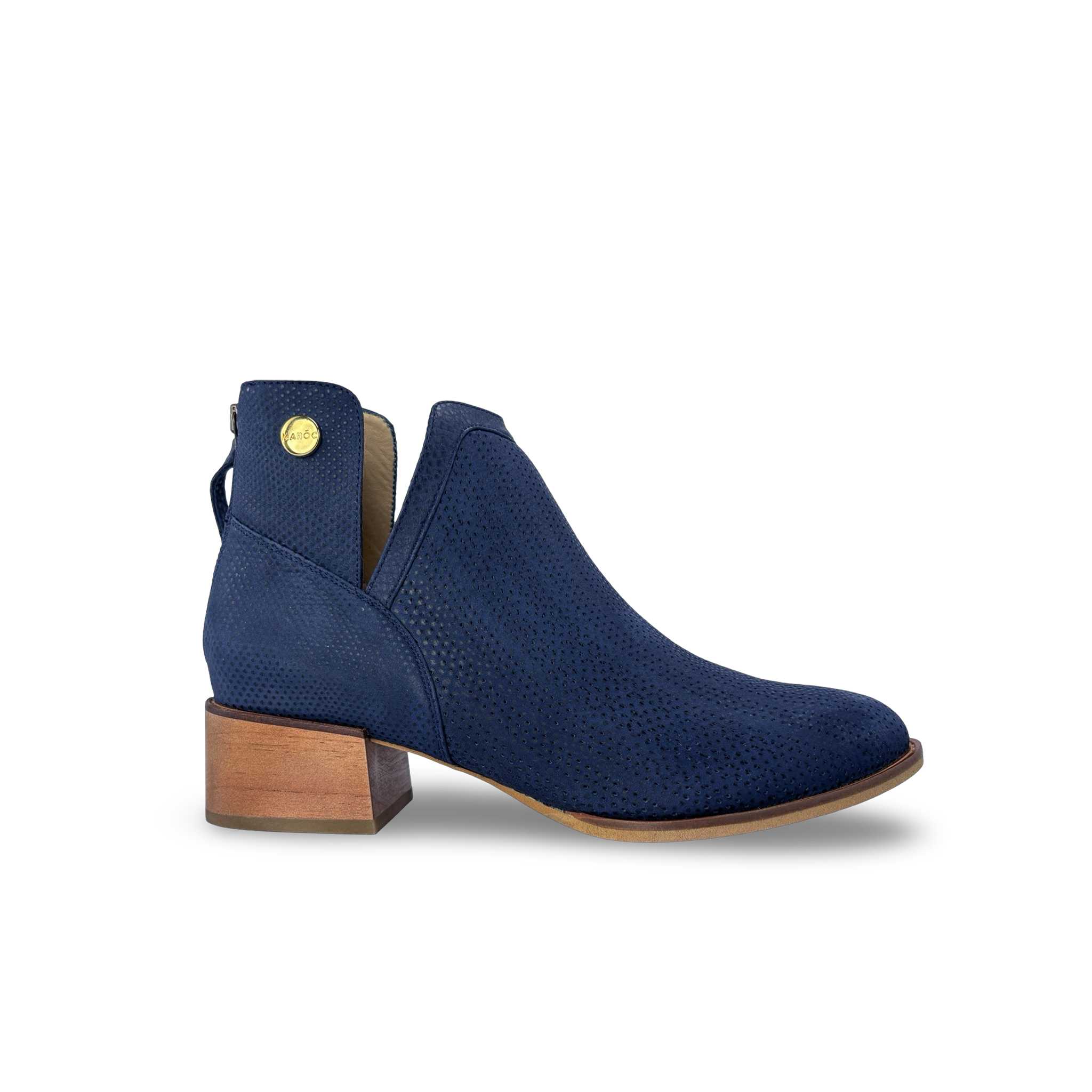 Botín para mujer de estilo atemporal y moderno, diseñado con aberturas laterales que aportan ligereza y comodidad al caminar. Su tacón de 3.5 cm, recubierto en cuero grabado con acabado amaderado, le da un toque distintivo y elegante. Fabricado en cuero vacuno microperforado, combina frescura, durabilidad y un diseño versátil ideal para acompañarte en cualquier ocasión.