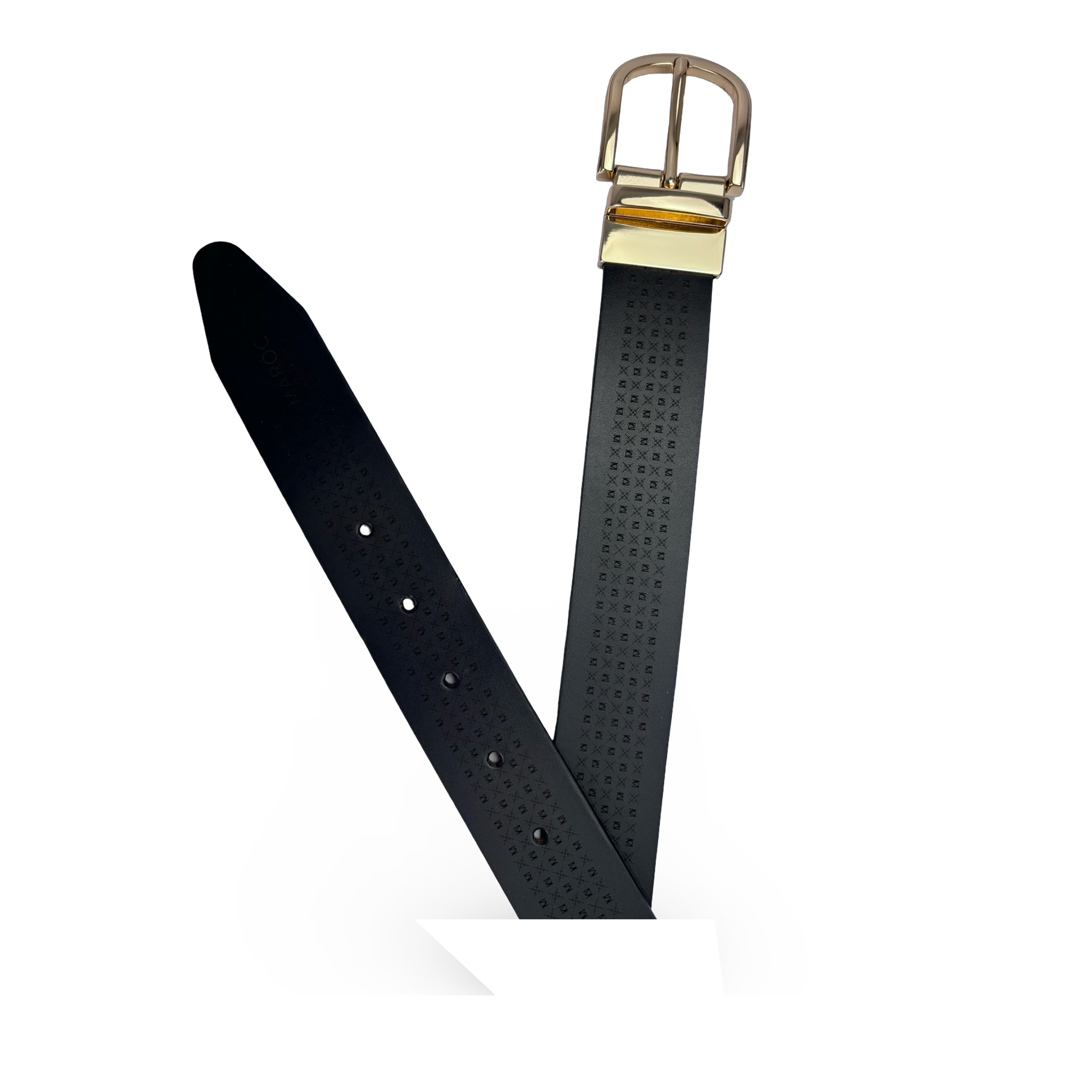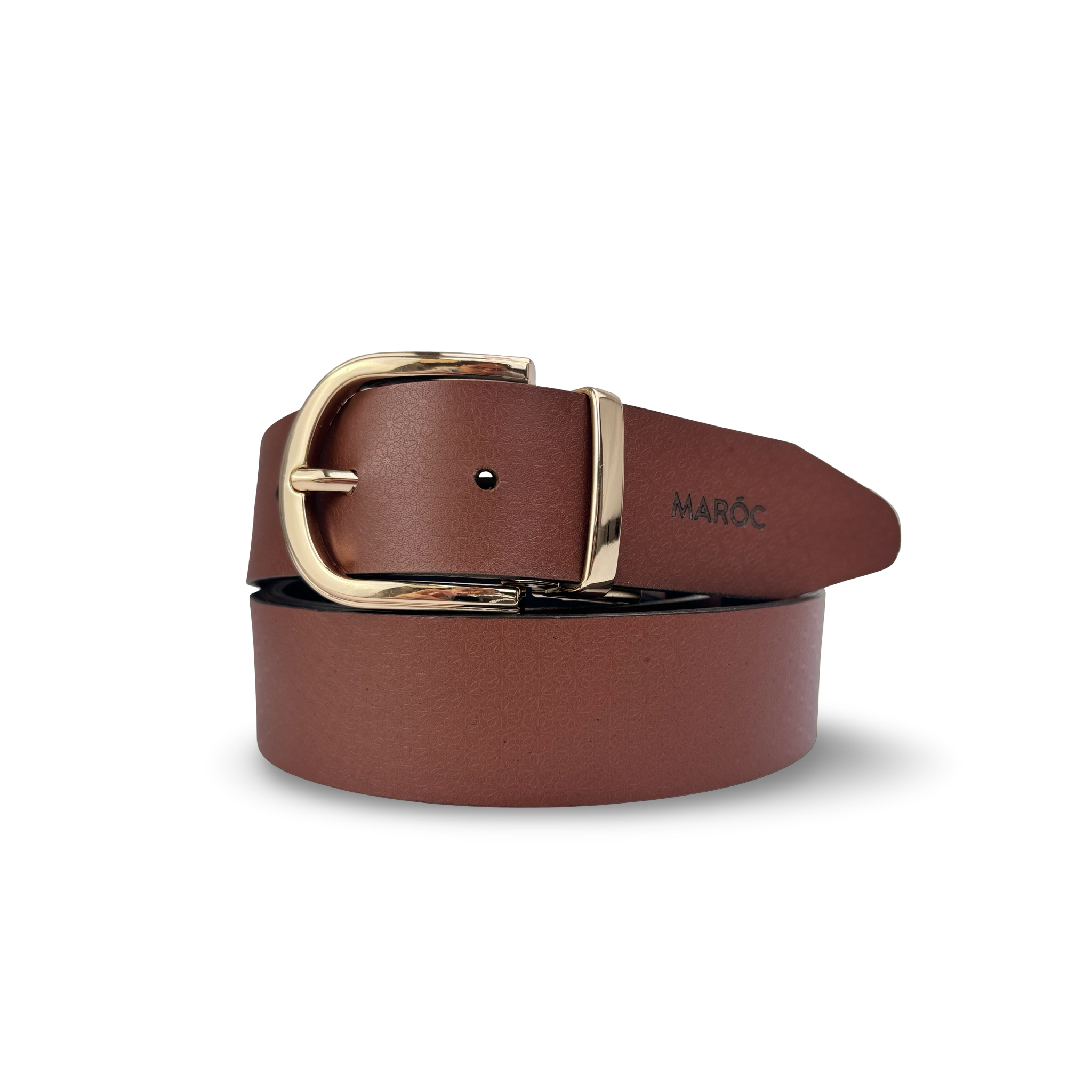 Un accesorio versátil y sofisticado que se adapta a distintos estilos en un solo diseño. Cuenta con hebilla reversible de forma asimétrica y dos opciones de uso: tono miel con grabado de girasoles o tono negro con grabado de la M de Maróc. Fabricado en Colombia en cuero vacuno grabado y liso, con herrajes resistentes. Grosor aprox.: 3.1 cm.
